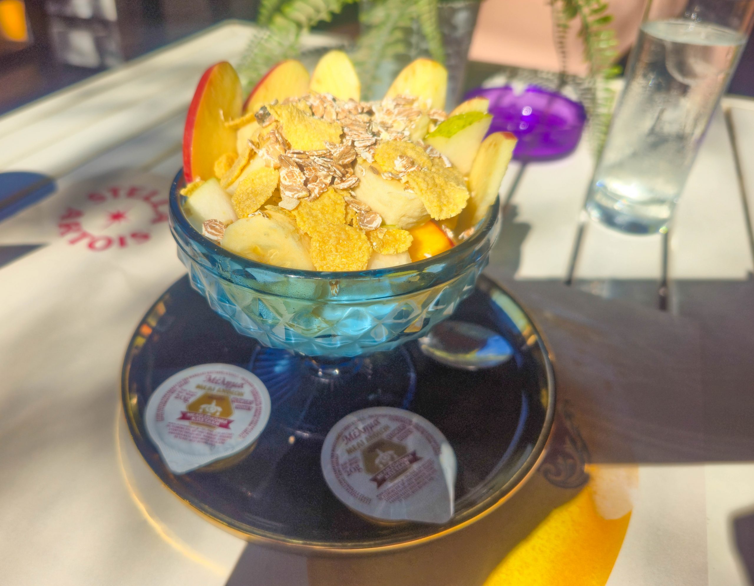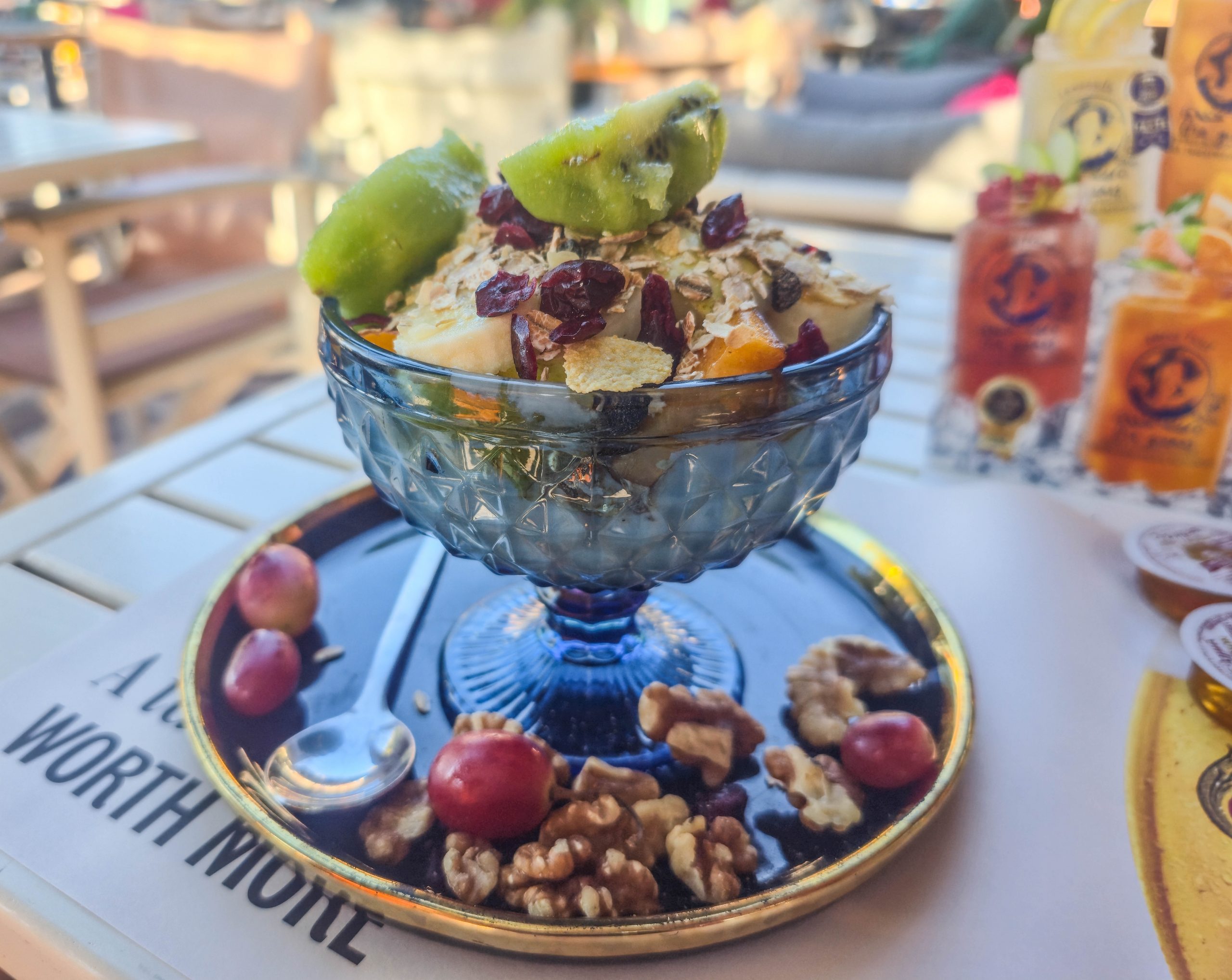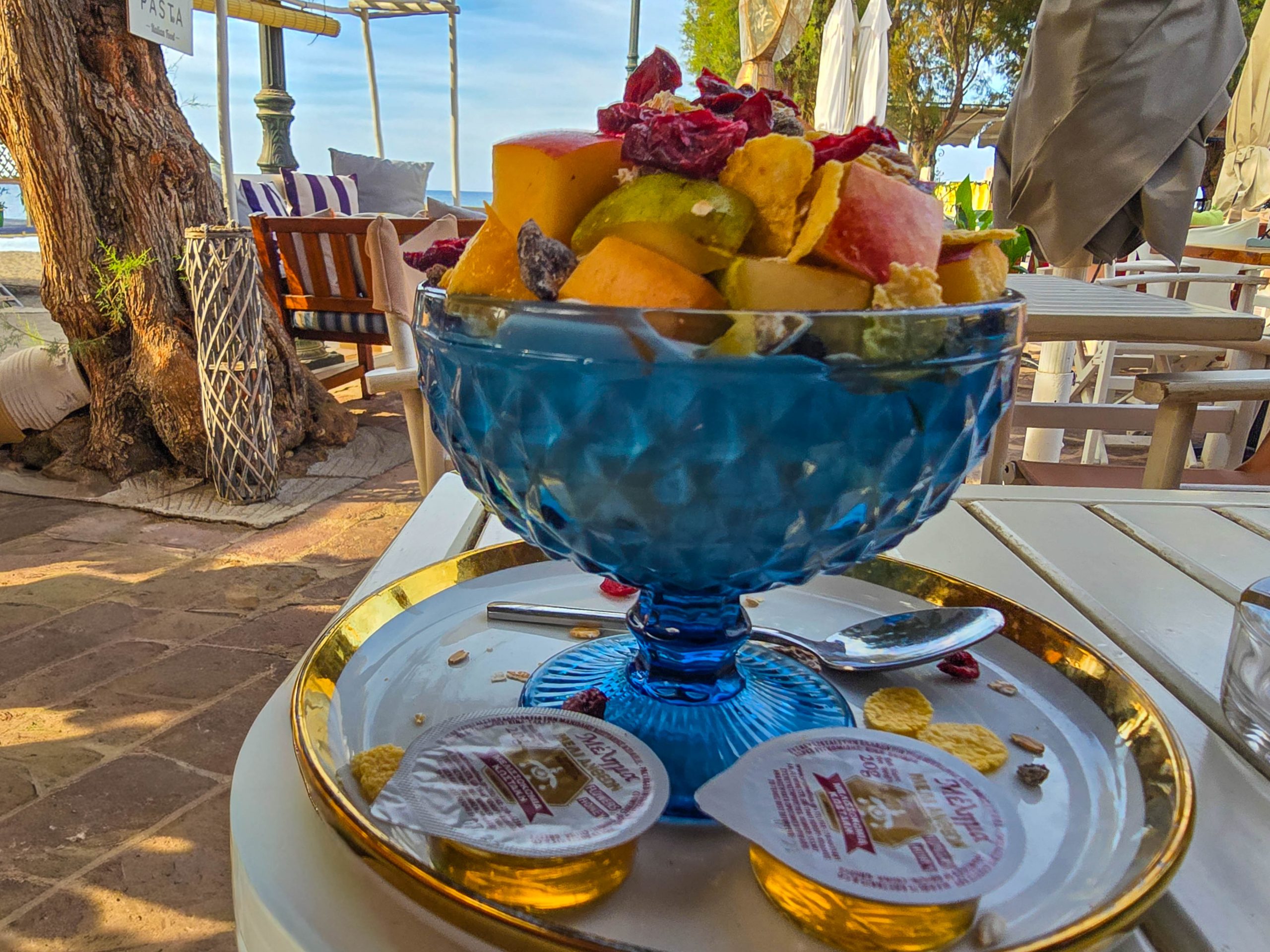 During my stay, I began to develop several rituals, the most important being breakfast. In the centre of the village, on the edge of the beach, is Yalos All Day, which quickly revealed itself as one of the village’s social hubs. Locals, visitors, early risers and late sleepers drifted in and out. Breakfast was exceptional — a beautifully presented bowl of Greek yoghurt and fruit, which became more elaborate on each subsequent visit. Sometimes I’d mix it up and replace the yoghurt with Eggs Benedict. On a couple of occasions, I also came here for an indulgent dessert and an early evening Margarita – classic, of course.