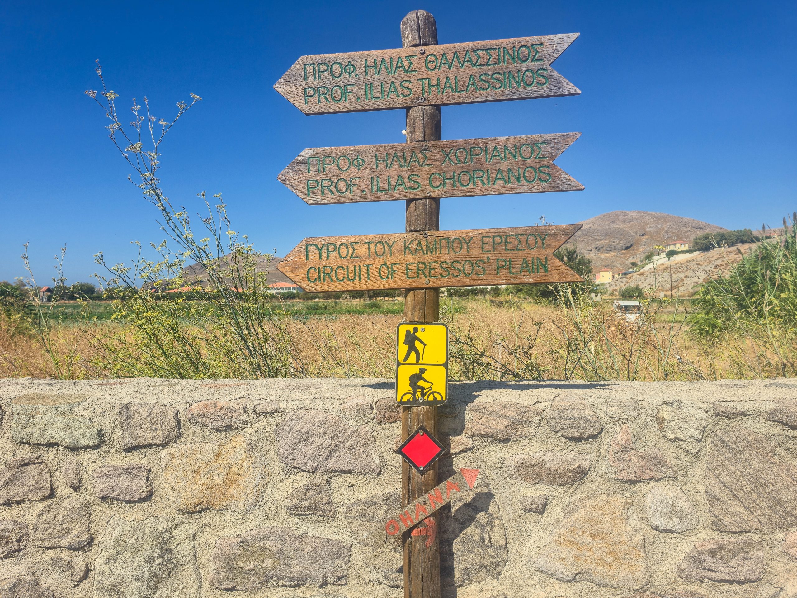 Further on, the landscape opens out. Scattered bars, the turn-off for the nudist beach, and the sprawling Aeolian Village Beach Resort punctuate a stretch of countryside that also forms part of the wider walking network around the Eresou Plain. From here, trails loop inland and climb towards Profitis Ilias, a classic Greek high point offering long views back across the bay and out to sea.