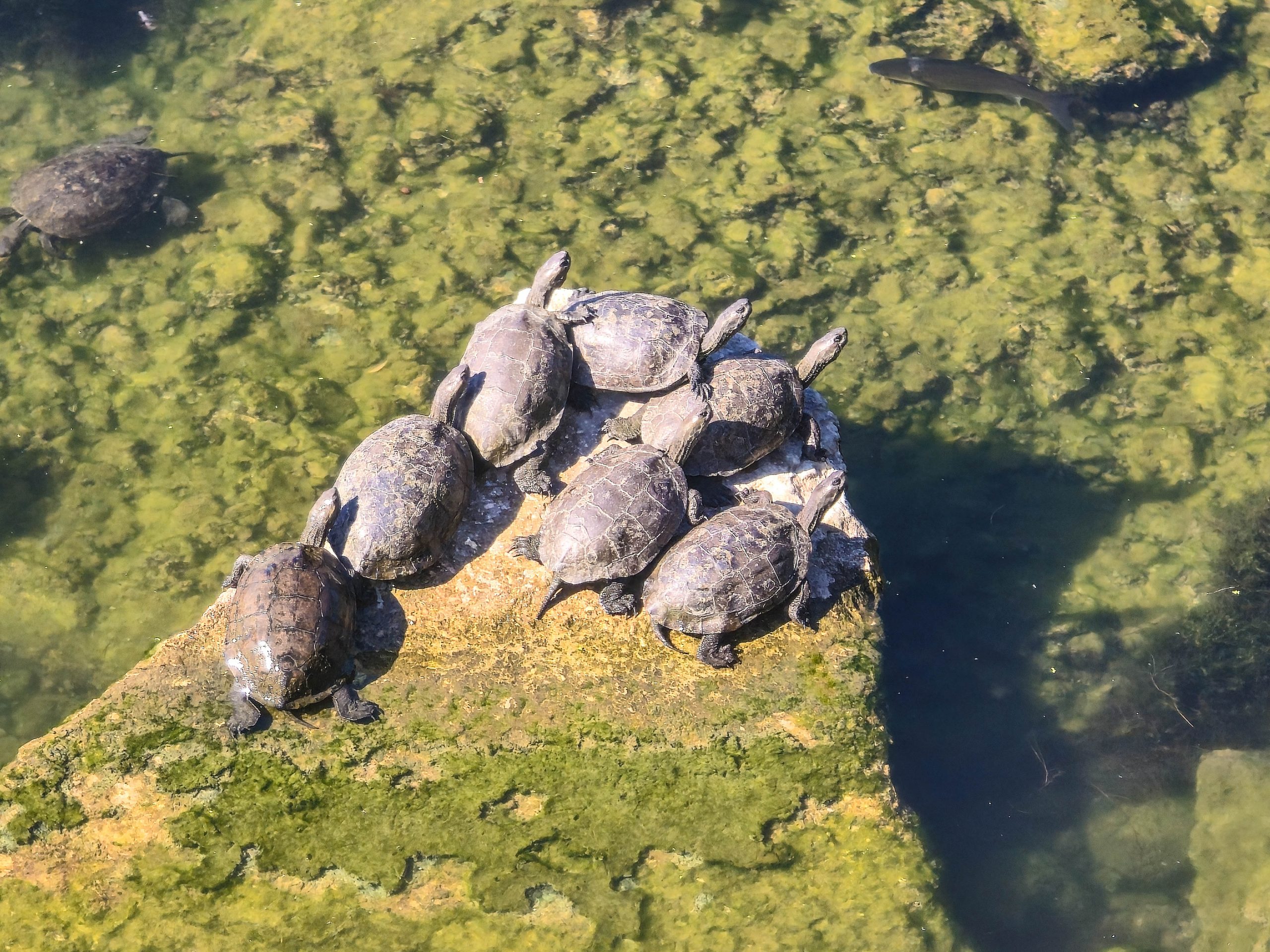Following the road around to the right is Turtle Bridge, where turtles bask motionless on rocks jutting out of the shallow stream. Grey mullet drift through the shallows almost like sharks circling their prey. Most turtles gathered in small groups, with the odd turtle alone on a small rock, enjoying its own company. It felt like an echo of life on the beach itself — clusters of friends drawn together, alongside those who preferred a little space of their own.