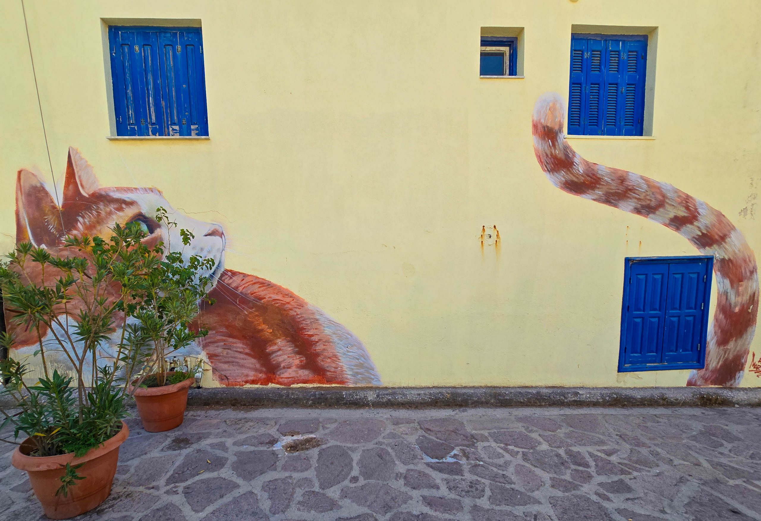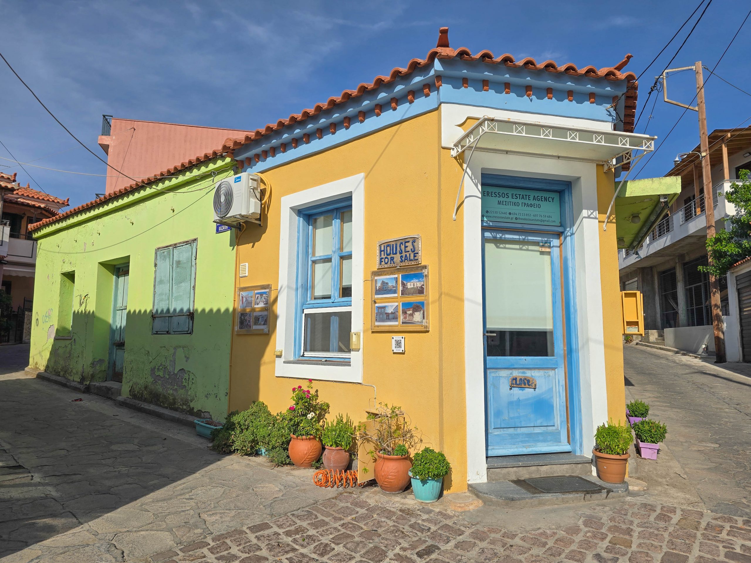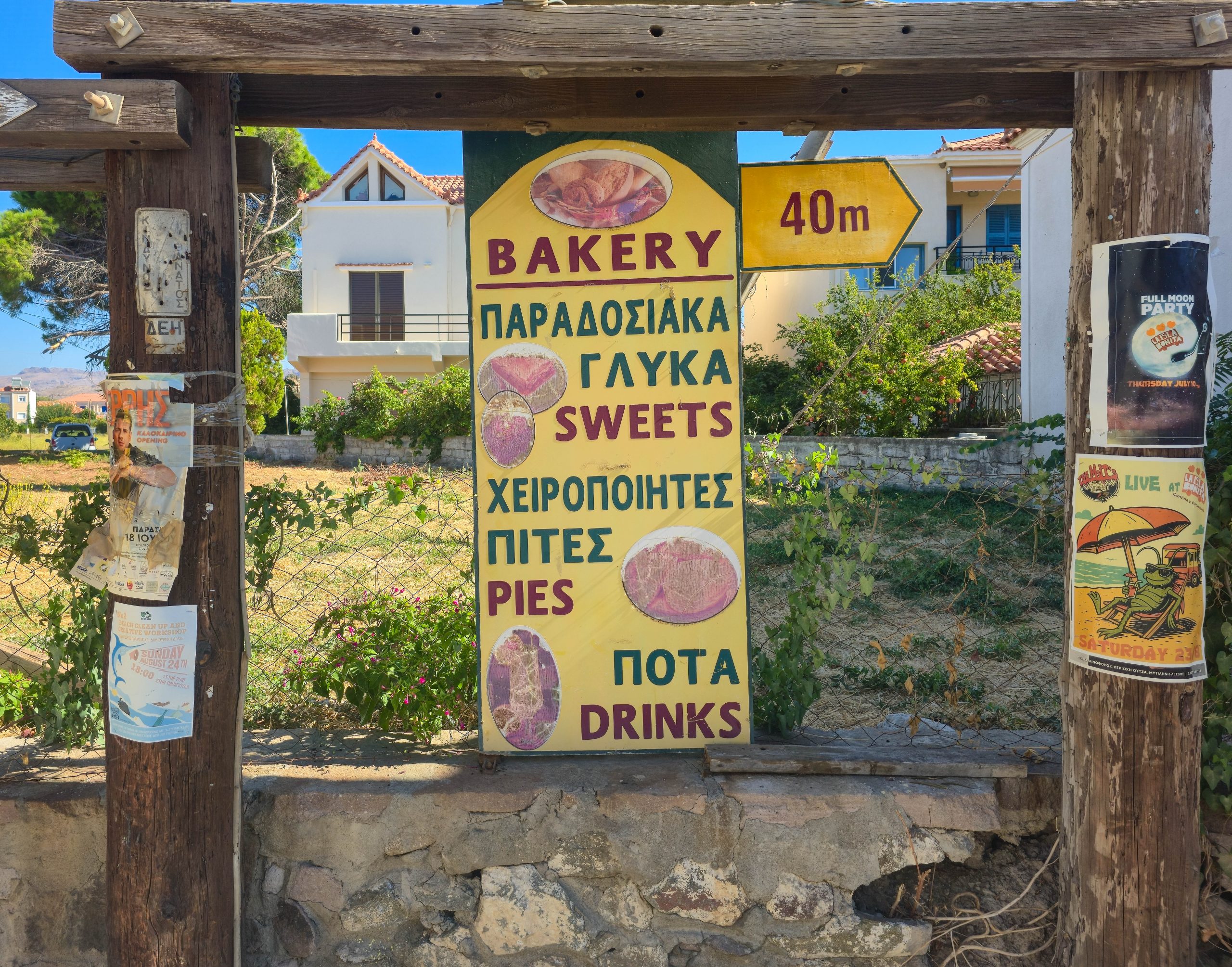 Despite its contemporary, concrete and cubist architecture, Skala Eresou isn’t completely without charm. Brightly coloured doors and shutters soften the geometry, while murals and street art — some of it said to be by an artist connected to Banksy, a claim I’ve yet to verify — add an expressive, slightly rebellious edge. Posters advertising talks, performances and workshops from the International Eressos Women’s Festival are pinned everywhere: on noticeboards, shop windows, café walls. In the centre of the village, the festival’s events office anchors this seasonal influx of creativity. Even as the festival winds down, its presence lingers — an atmosphere rather than an event.