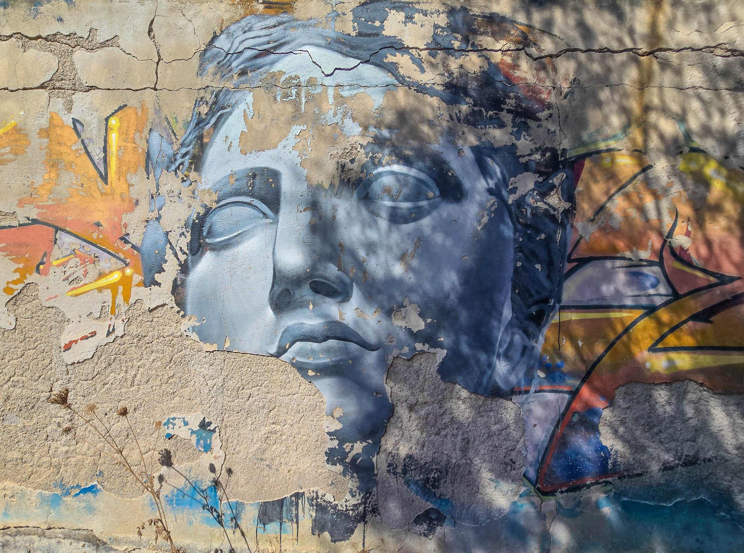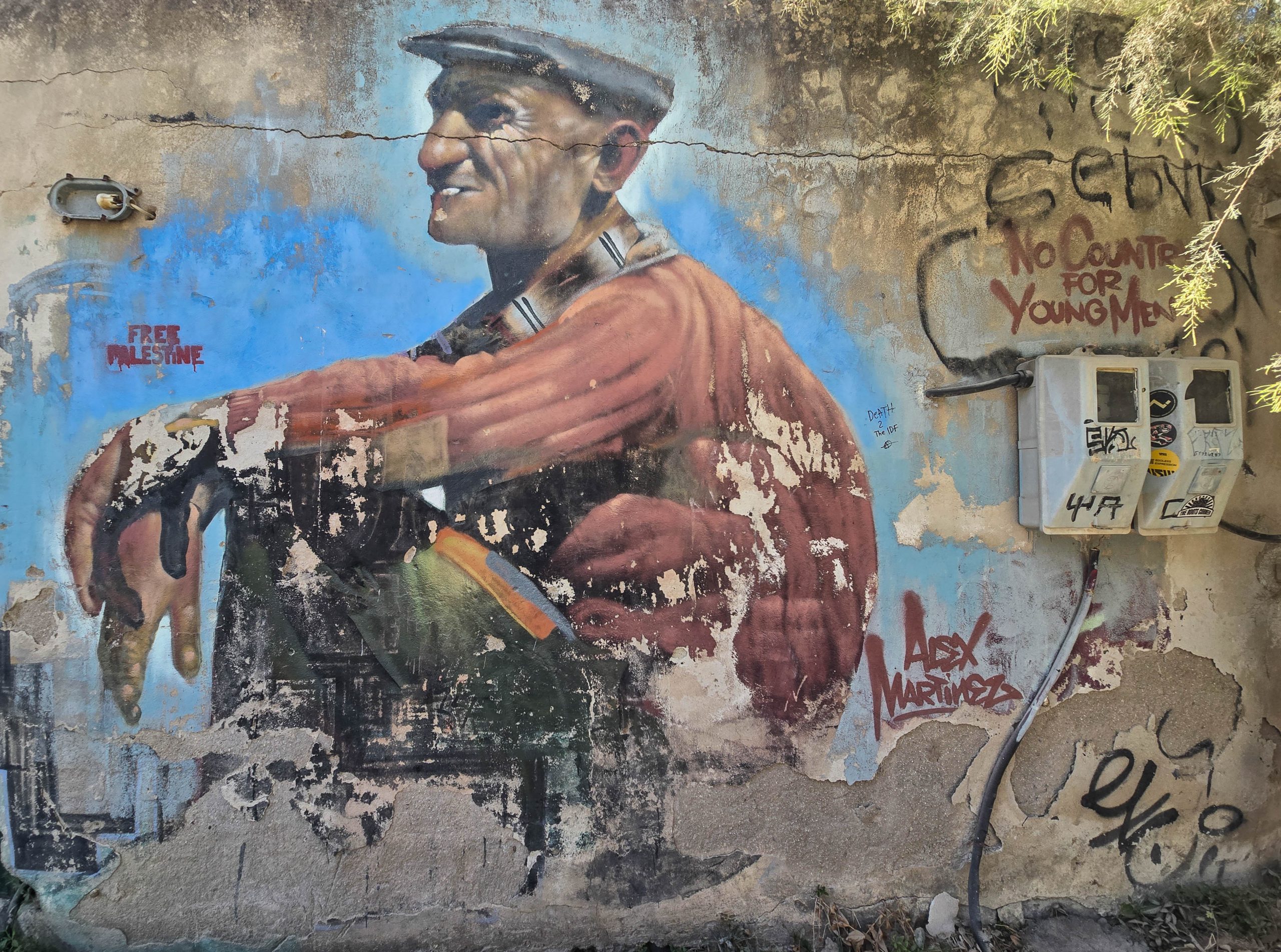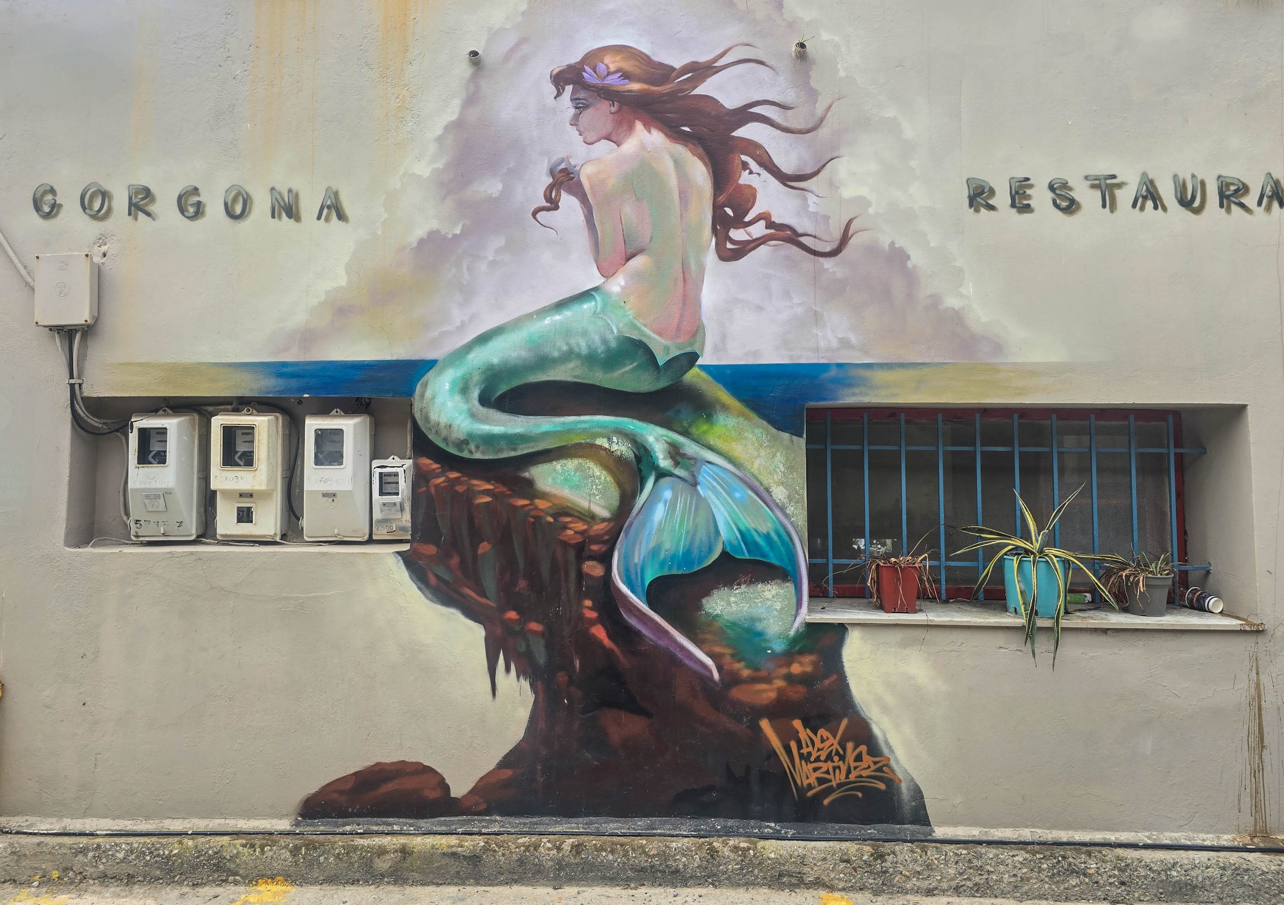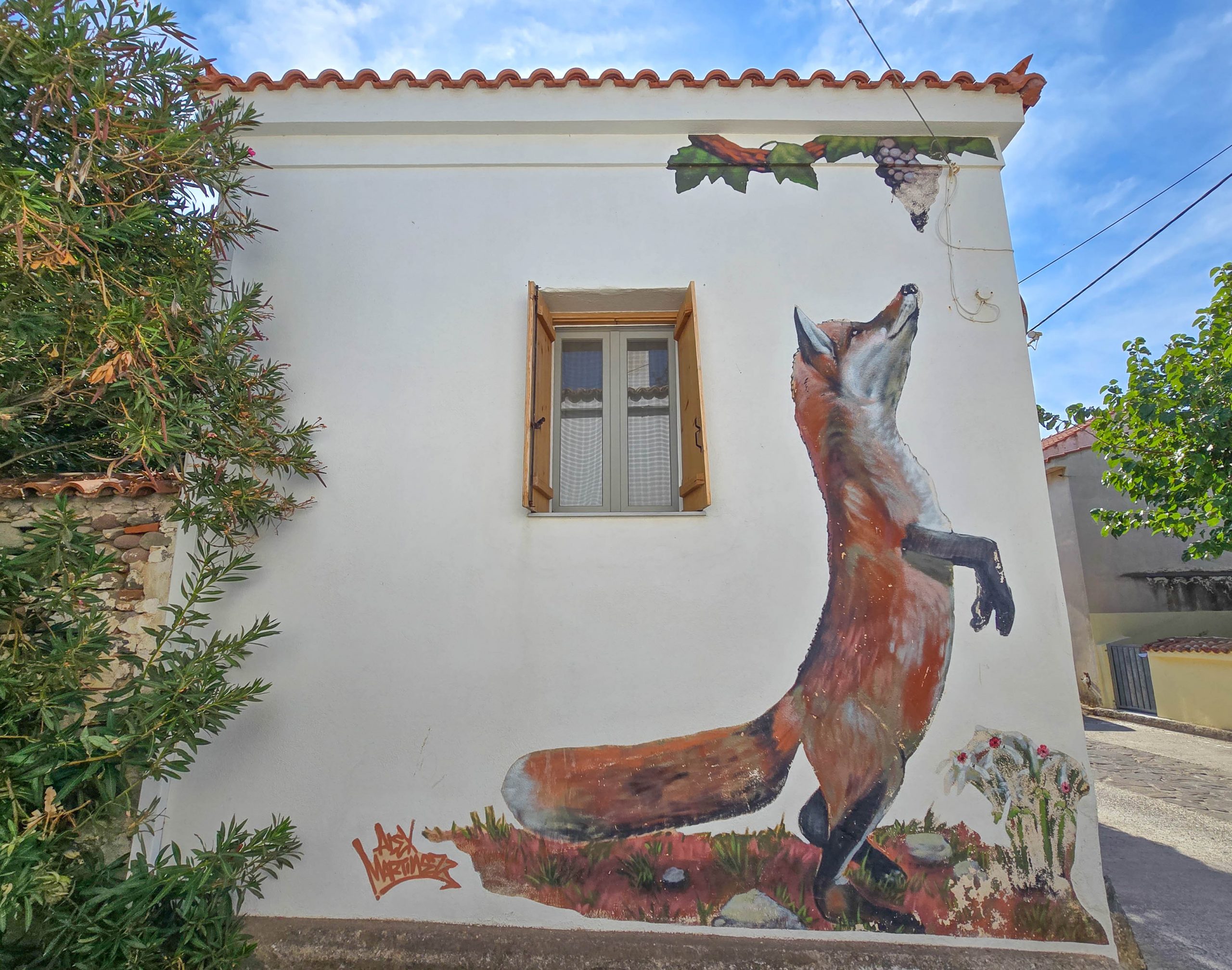 Despite its contemporary, concrete and cubist architecture, Skala Eresou isn’t completely without charm. Brightly coloured doors and shutters soften the geometry, while murals and street art — some of it said to be by an artist connected to Banksy, a claim I’ve yet to verify — add an expressive, slightly rebellious edge. Posters advertising talks, performances and workshops from the International Eressos Women’s Festival are pinned everywhere: on noticeboards, shop windows, café walls. In the centre of the village, the festival’s events office anchors this seasonal influx of creativity. Even as the festival winds down, its presence lingers — an atmosphere rather than an event.