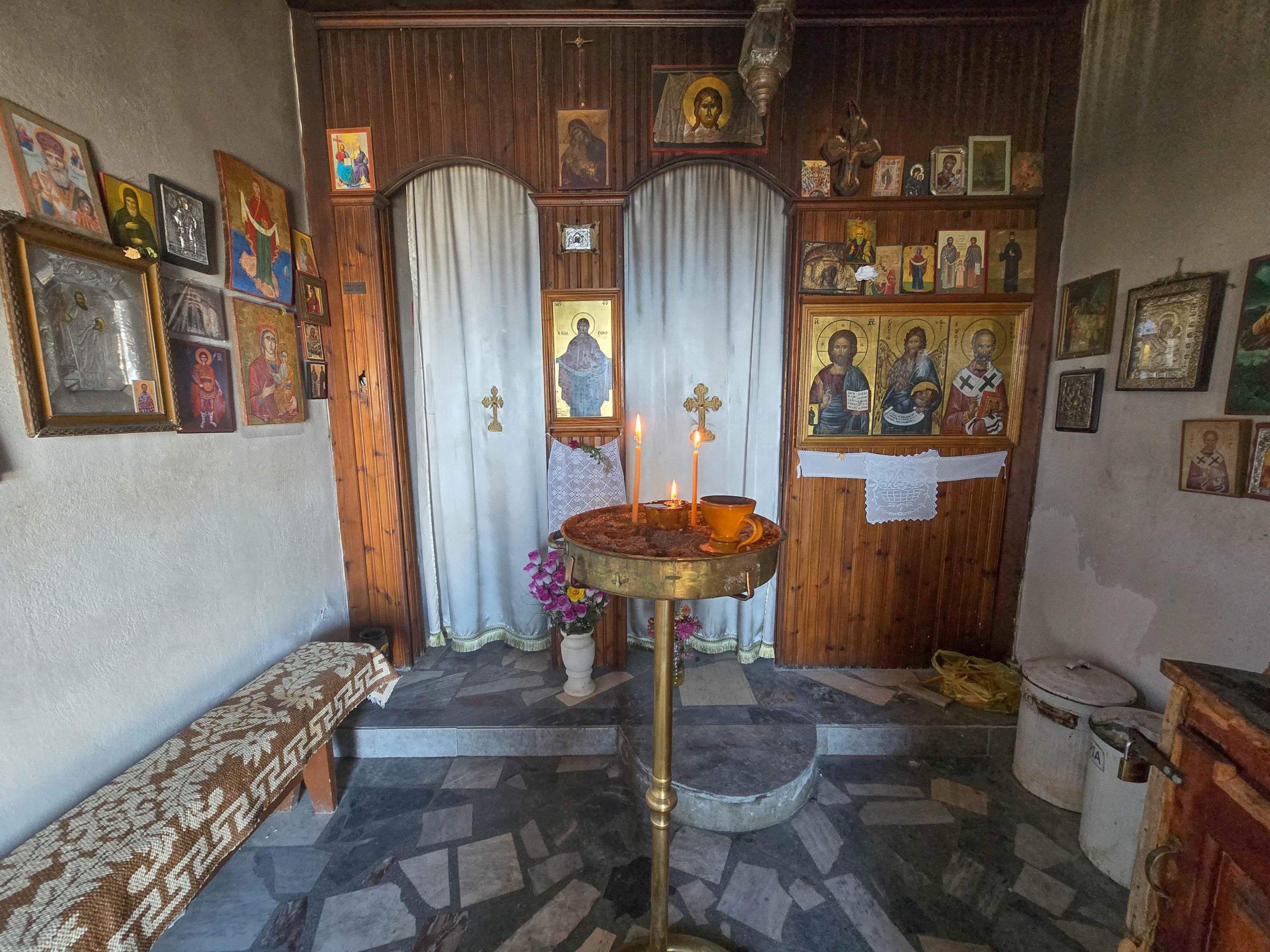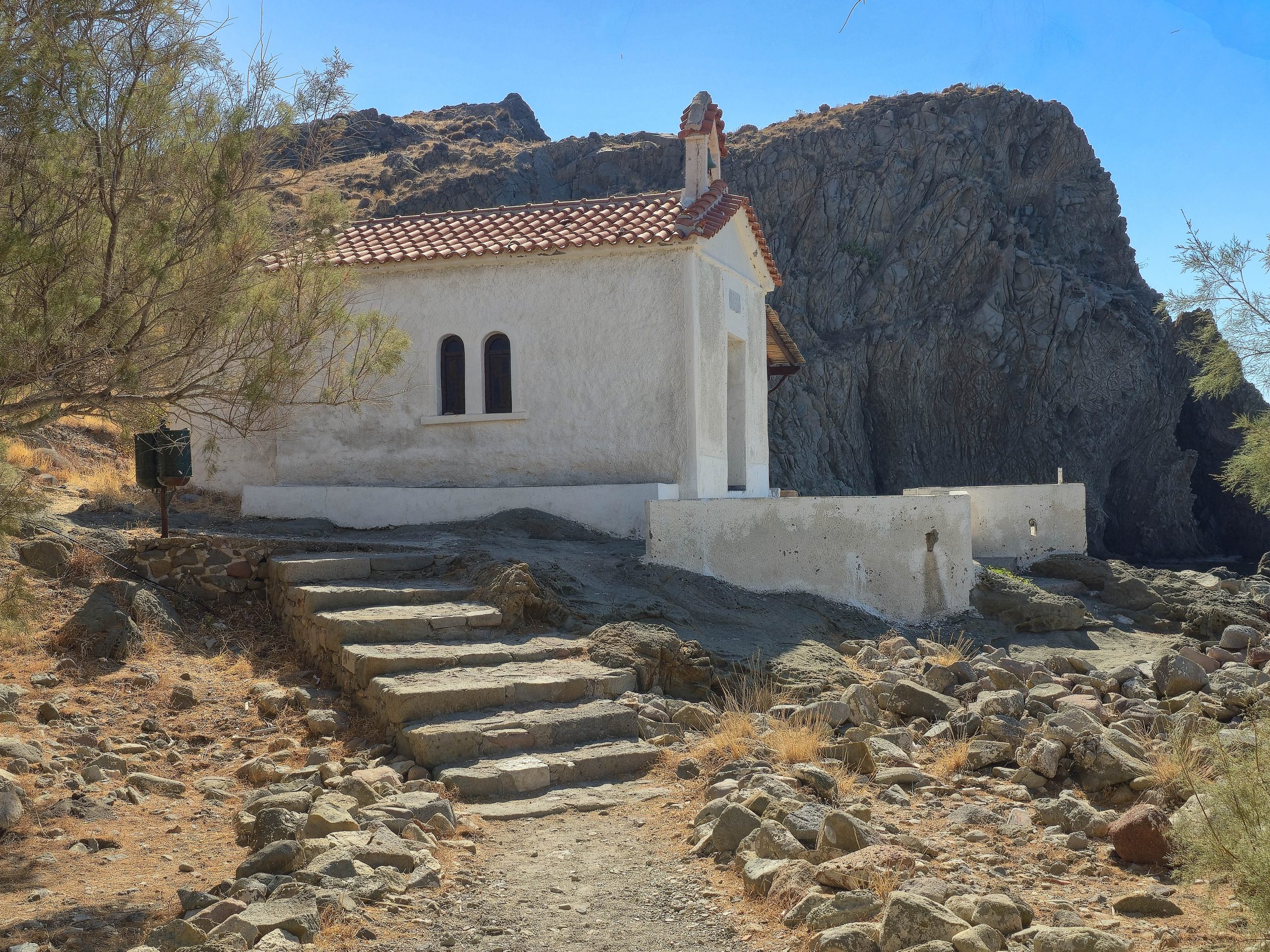 Nearby, a small, modest chapel dedicated to Panagia sits quietly by the water — less a landmark than a presence, echoing the long tradition of coastal chapels offering protection and reassurance to those who live and work by the sea. The door is open.