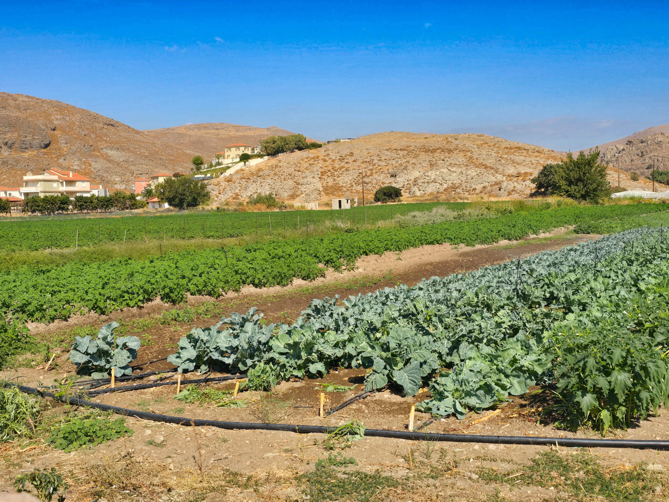 Another routine that I established during my stay was a walk to Turtle Bridge and into the landscape beyond. A dusty, tree-shaded track behind the beach leads past cultivated plots that are clearly more than gardens — smallholdings where vegetables are grown for self-sufficiency rather than sale. Here you can see how the landscape is so different to other parts of Lesvos. Low, rolling volcanic hills surrounding a rich and fertile plain.