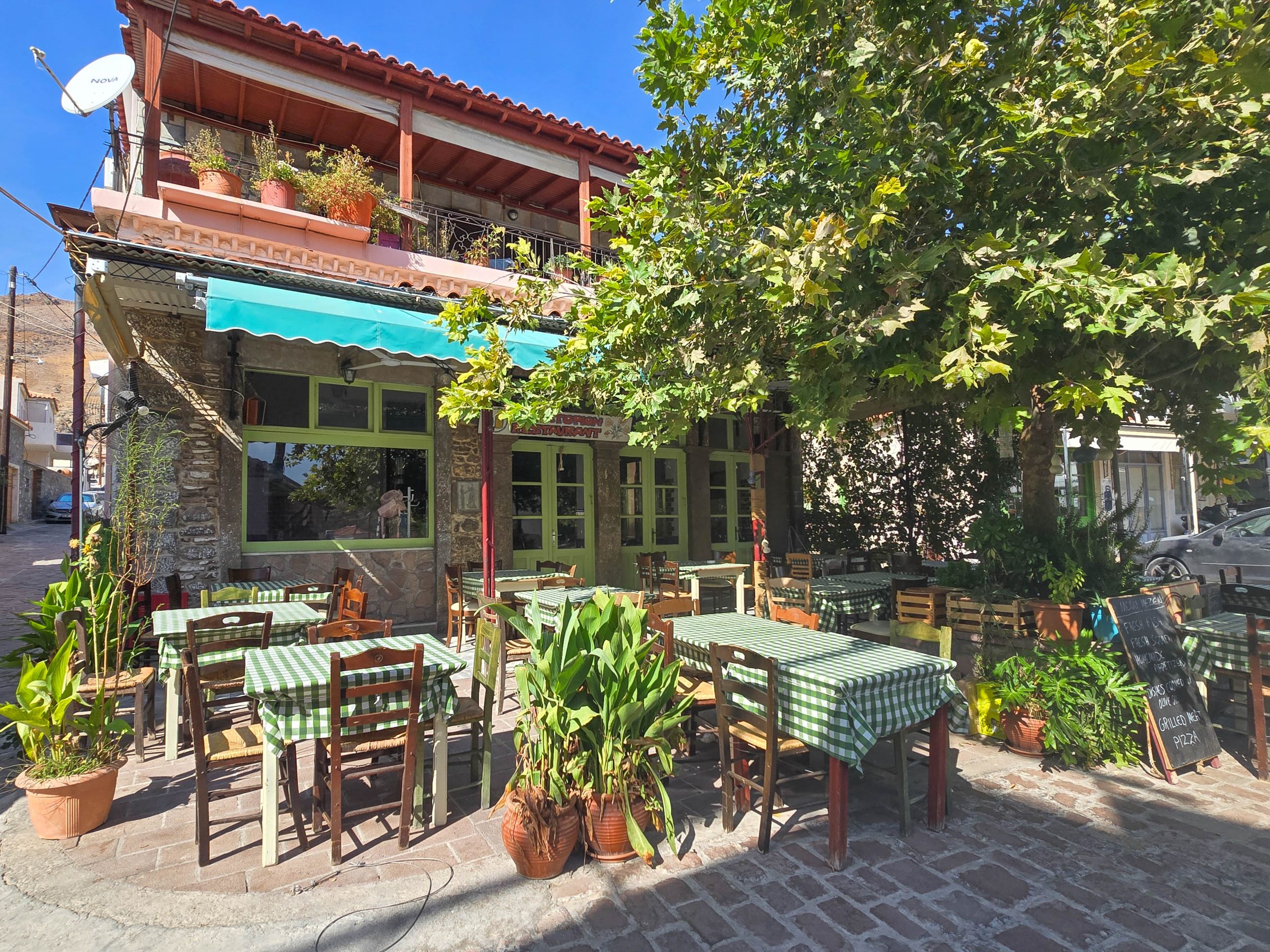 Eresos, the older, original settlement from which Skala Eresou takes its name, is perched around 280 metres above sea level. It feels a world away from its coastal skala — cooler, quieter, more authentic and grounded in the surrounding volcanic landscape. It’s a place that feels shaped by everyday life rather than seasonal arrivals. Stone houses made from volcanic stone cluster around narrow streets, small cafés and kafenia anchor the square, and the pace feels resolutely local.