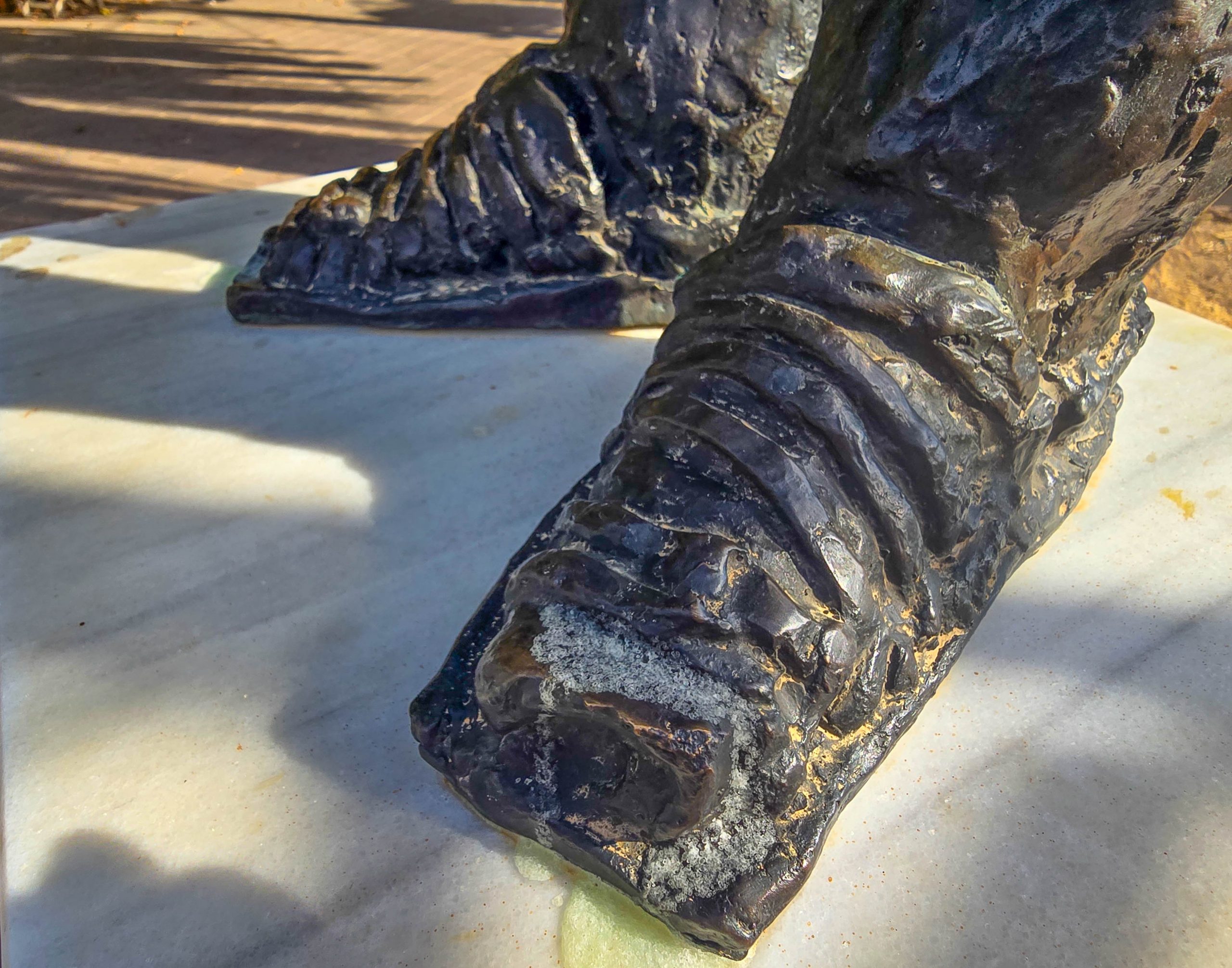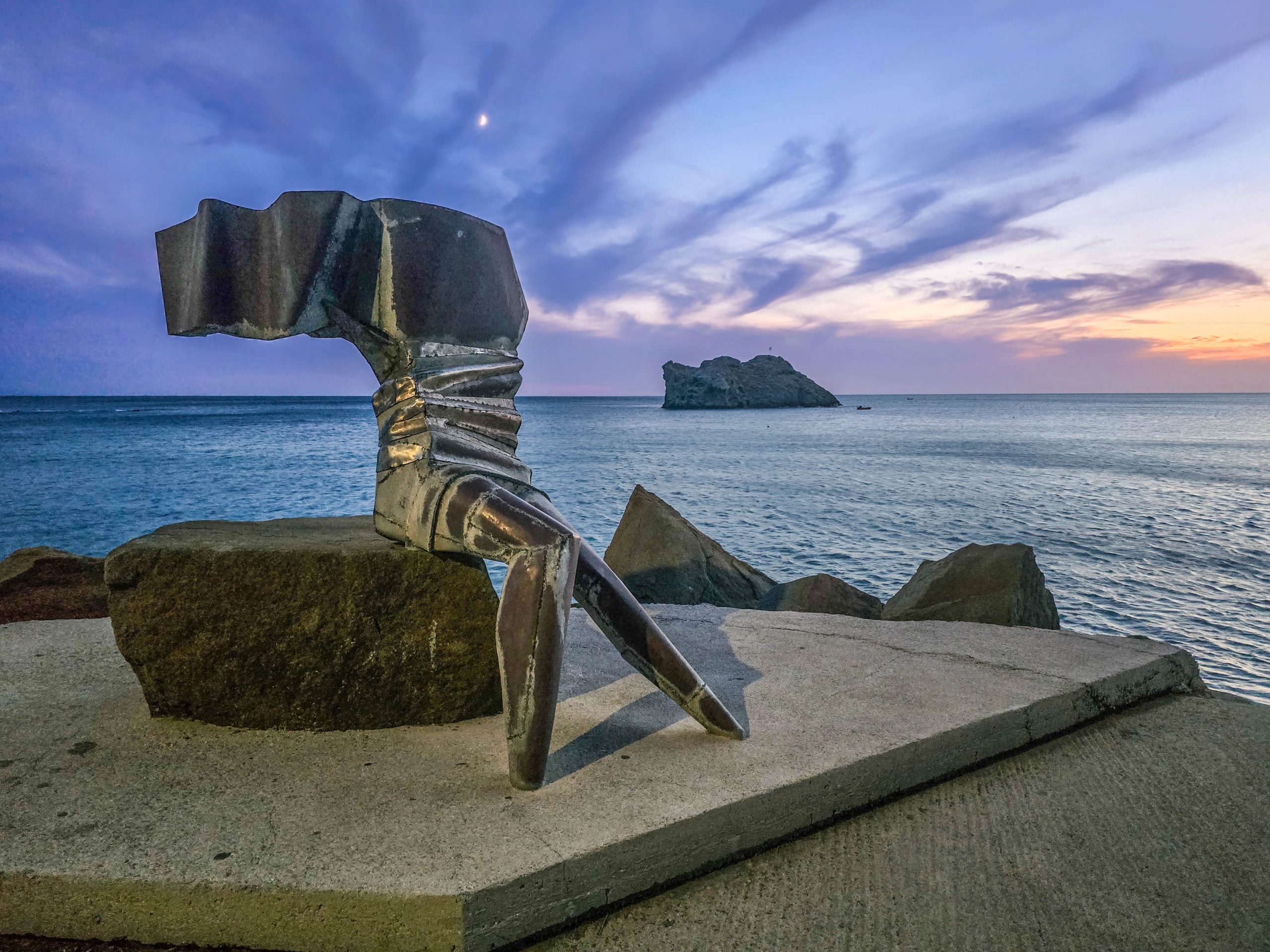 Back in the centre of the village and heading east, the bay curves gently and the sand becomes slightly shinglier. This end is noticeably quieter and unorganised. Sculptures appear along the shoreline — contemporary pieces placed thoughtfully, inviting passersby to pause. Badger Rock, a short distance out at sea, is the perfect backdrop. Nearby, a small marina hums with low-key activity: fishermen mending nets, tinkering with engines, continuing routines that long predate tourism.