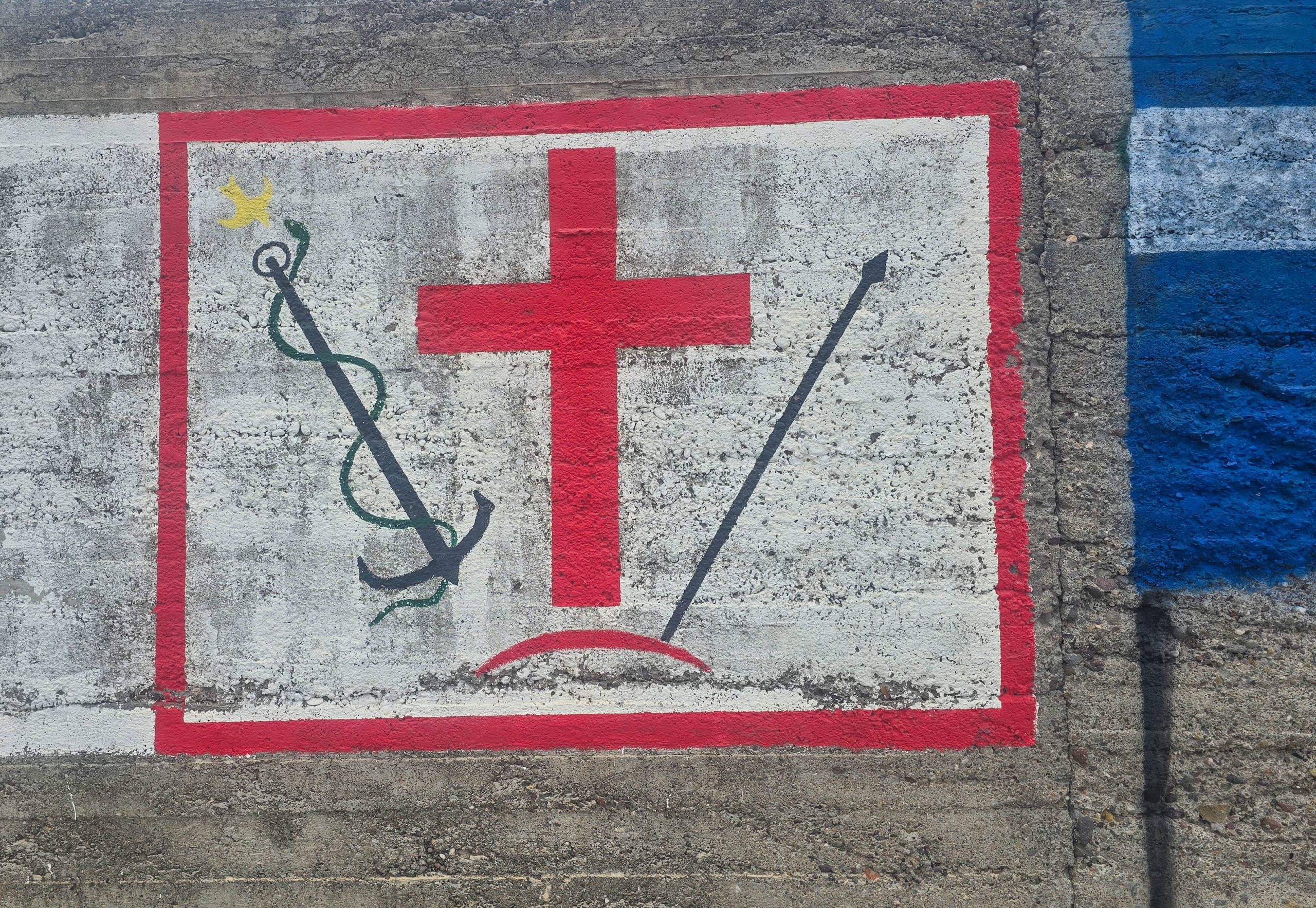 Above, on the hillside, stands a small vigla — a watchtower — alongside the remains of earlier structures. Such lookout points were once vital in coastal defence networks across Lesvos, offering early warning of approaching ships. Along the harbour arm, a large commemorative painting marks 200 years since the start of the Greek War of Independence. This reflects the broader national story that reshaped the island’s identity in the 19th century.