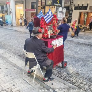 I do eventually manage to drag myself away and walk back towards Ermou. In that short space of time since I was there the street is beginning to get busy. Mr Taraposos is out with his barrel organ and other street vendors begin to amass.