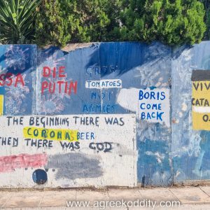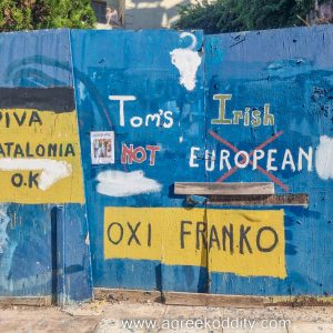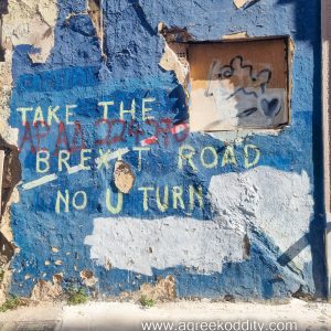 Wandering aimlessly can take you to some interesting places. I head read about this place before but had never actively sought it out – but here I am. Toms Place is on Iperidou Street. Tom is one of the eccentric characters that make up the city of Athens. Tom isn’t Greek. I’d read that he is originally from Northern Ireland. I’m always drawn to grafitti/street art and all things quirky and I noticed the political slogans before I realised where I was. I don’t agree with his stance on Brexit but I’m curious nonetheless. Behind the plywood hoardings are what remains of Tom’s house which was destroyed in the earthquake of 1999. Apparently he no longer lives there – I guess it has been condemned as unsafe but prior to this he filled the space with a collection of quirky art installation pieces. This I would love to have seen but unfortunately that’s not possible today.