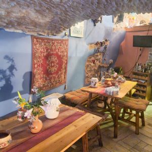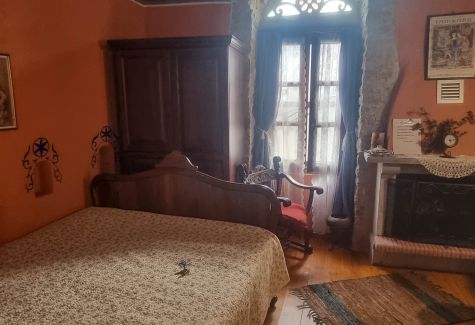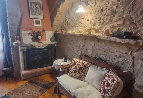 After entering To Pounti from the street, you arrive into a small stone hallway. Stone steps down to the left lead you into the old stable and what now serves as the breakfast room and reception. There are little nooks everywhere. One located on the ground is a small recess where the chickens would roost but has now been tastefully repurposed into a decorative fireplace. Another nook just below the ceiling was a store for animal feed – handy enough for access but out of their reach of the livestock. This now forms the perfect stage for a Greek shadow puppet theatre.