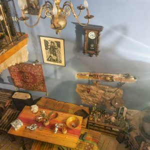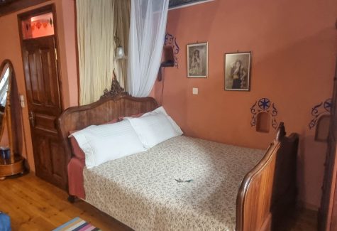 Continuing up the stone steps and through a door, you arrive at the accommodation level. There are two rooms – Fegari (Moon) which is a double room (and what after 2 stays I now call ‘my room’) and Estia (Hearth) which is a larger room with a double bed on one level and another double bed on another level. Fegari is accessed by two floating stone steps projecting out of the wall. Again the rooms have been sympathetically designed with antique furniture and unique pieces of artwork.