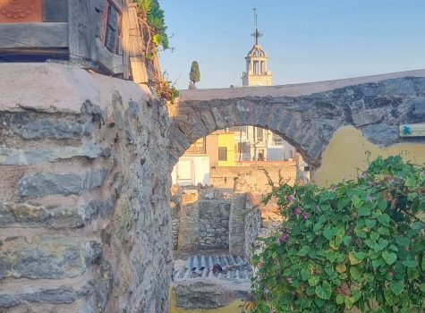 To Pounti is a 14th-century house typical of the mastic villages in Southern Chios. The houses were built in close proximity to each other creating narrow labyrinthine alleyways. This was all part of a defensive strategy to protect the precious mastic at all costs. The rooftops are where battles were fought. The narrow bridges that connect one side of the street to the other would give the defenders the advantage over the marauding pirates. Many buckles have been swashed above where we stand today.