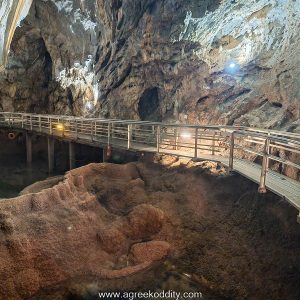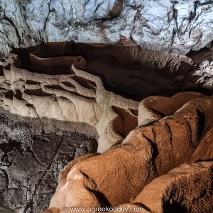 We are guided into the cave and are told that the cave was first explored in 1964 by the local residents of Kastria. A year later this was conducted more formally with the Greek Mountain Climbing Association and foreign specialists. During the explorations, human bones and also the remains of hippopotamus were found at the bottom of the cave. Say what! A hippopotamus! There are 13 terraced lakes in total of varying sizes that overflow from one into another. The levels will fluctuate throughout the year depending on the amount of rain or snow the season has had. This winter has been very mild with very little rain or snow so the lakes are currently very shallow. There walkway is very narrow and the height of the cave is very tall because it is set along a fault line. Adorning the walls of the cave are magnificent curtains of petrified waterfalls.