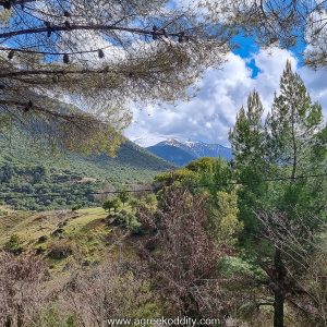 We set off out of Kalavryta, on the main road that goes past the site of the massacre. Alex tells me that soon we will get a good view of Mount Chelmos which can’t be viewed from the town. Sure enough, the snow-capped peaks and pine-clad slopes appear – though my photographs from a speeding taxi are never going to do it justice!