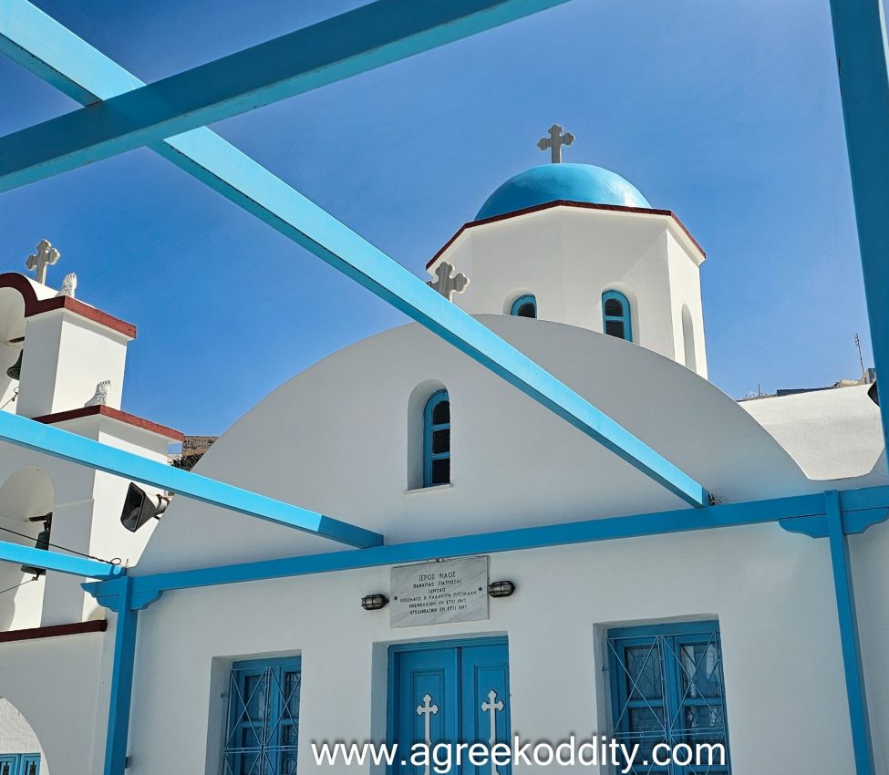 There seems to be a high ratio of churches for such a small village. Thirassia as a whole has a population of around 150 people, the majority of which live in Manolas. The first church on my right takes my interest right away. Panagia Giatrissa (the Healer) can be seen through the struts of a pergola at the front of it. The white walls are almost blinding and the pale blue dome and windows leave you in no doubt that you are in the heart of the Cyclades.