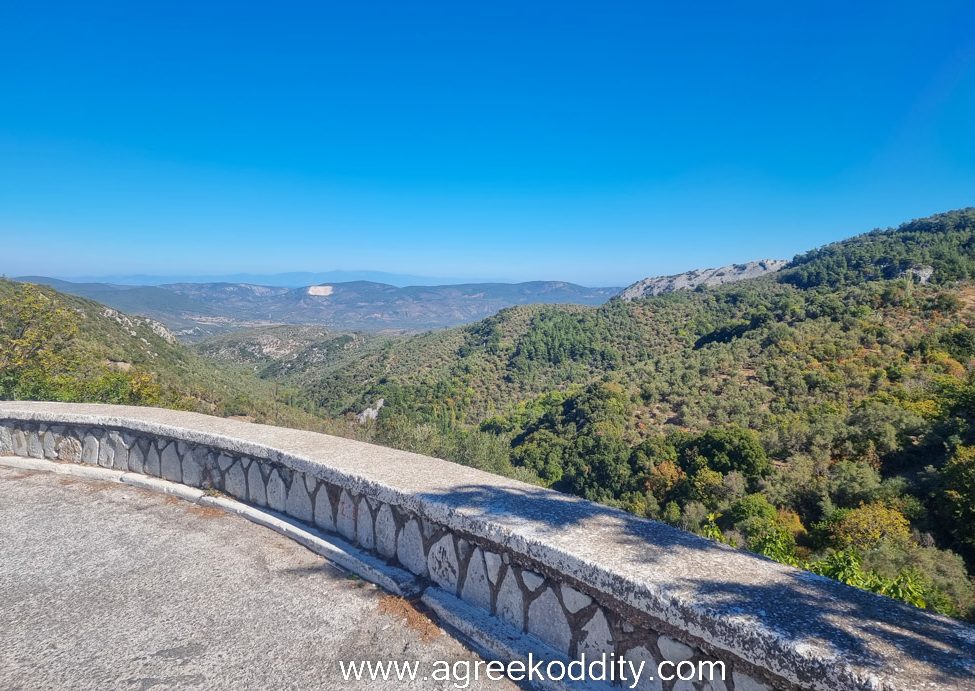 I carried on climbing. Once beyond the shelter of the houses the windier it became. Now at the end of October, there was a distincet chill in the air. I hadn’t come with a jacket or extra layers so my thin short-sleeved top would have to do. It wasn’t unbearable, so I pressed on until I reached a bend in the road where the view opened up spectacularly across the valley. Perched on the slopes of Mount Olympus, Agiasos looked out over dense olive plantations and thick woodland. I imagined that if I continued along this road it would eventually bring me to other mountain villages, but this is far as I would go today.