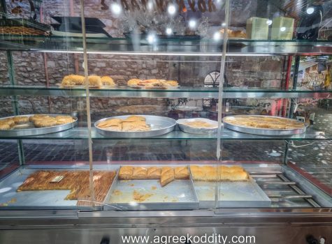 While I was still dithering over food, I remembered Chara’s instructions about the Vasilopita. I’d find it in the bakery just beyond the main church. As luck would have it, I was already nearby.