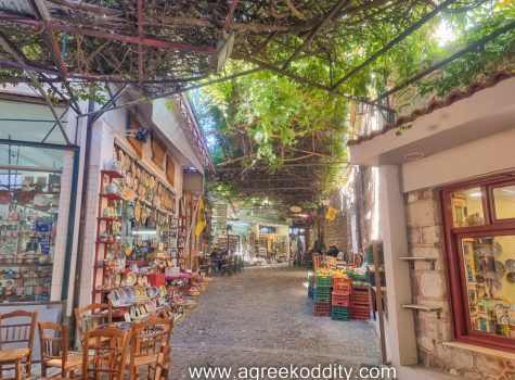 At the end of the row of houses, a doorway invited me enter and soon after I found myself in the courtyard of a church – the main church of the village, Panagia Agiasos. A sign had indicated there was a museum close by but I got distracted and followed the courtyard around to another doorway. Stepping through it felt like walking through the back of the wardrobe into Narnia. I emerged into a beautiful cobbled street, shaded by vines slowly turning from green to gold to red. Outside the shops, was more of the villages famous brightly coloured pottery – some traditional, some edging towards the contemporary.