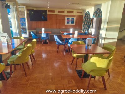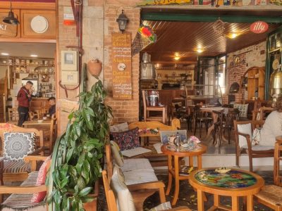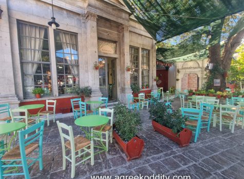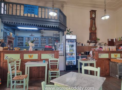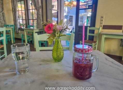 Back on the square, I resumed my hunt for somewhere to eat. A place selling loukoumades looked enticing though that wasn’t the meal I had in mind, and the wasps buzzing around the plates put me off anyway. I ended up in the large café called Kafentaria on the square with the brightly coloured tables and chairs. Inside, it was gorgeous – big windows flooding the room with light, and décor in keeping with the architecture of the village perfectly.