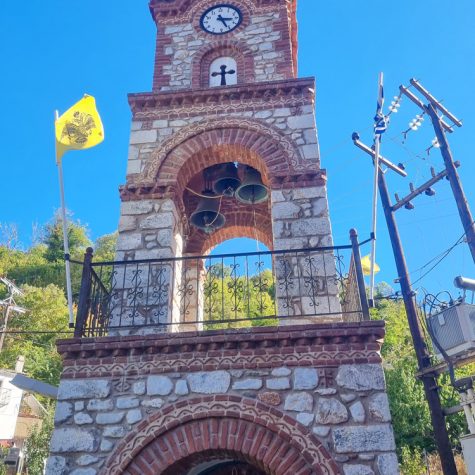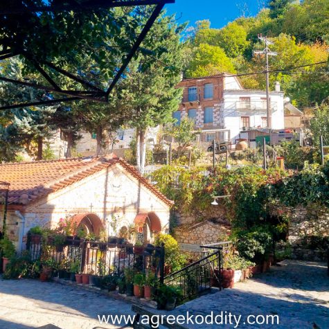 As I began walking into the village, the first thing that caught my eye was the bell tower of the Church of Zoodochos Pigi. The church itself was closed and the gate locked, but it was worth the short detour. The church was flanked by traditional stone houses, many with gardens overflowing with pumpkins, cabbages and all manner of fruit trees. Beyond that, the hillside was covered in trees just beginning to take on their autumn colours.