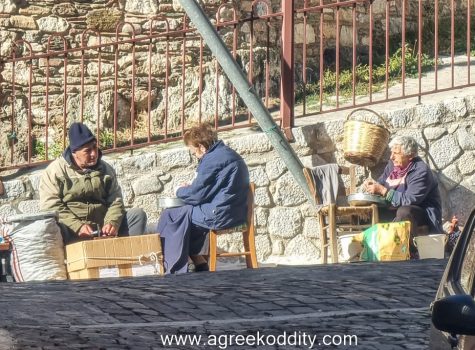 On my way back down towards the village, an elderly lady stopped me and pointed, speaking rapidly in Greek. From the way she rubbed her hands over her arms, I knew she was asking if I was cold. I wanted to tell her I was from the north of England, where we’re tough and barely feel the cold. In English that would have meant nothing, so I cobbled together “mikro kryo” while pointing at myself – I’m only a little bit cold. She looked horrified and proceeded to show me every layer she was wearing. I counted at least six.