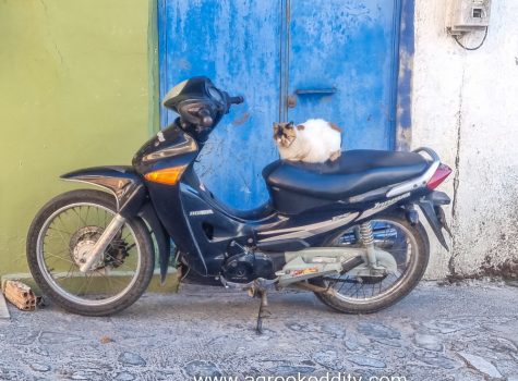 Back in Mytilene, the first thing I did was head straight to the hotel to put on warmer clothes. No matter how unaffected by cold weather I thought I was, the mountain air had chilled me to the bone. It had also exhausted me so I decided to go for fast food this evening. Meating was close to the hotel so I took an outside table and ordered a small bottle of retsina and Mexican fajitas. Not exactly the traditional Greek meal I’d been searching for all day, but it would do.