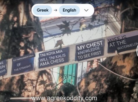 Eventually, a crossroads where the street began to plateau. In its midst stood a large plane tree decorated with pottery and surrounded by handwritten signs. Google Translate struggled with the phrases, only half-translating them or missing the point entirely, some with comical results.