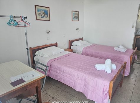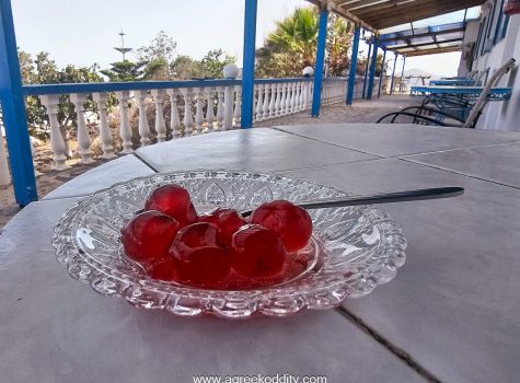 The concrete road snakes its way around the back of the island and then begins to rapidly ascend. I’m staying at a place called Zacharo Rooms also known as Jimmy’s. It sits above the main village of Manolas. I’m met at the gate by Babis who takes my bag to the room where he gives me directions to the minimarket and tells me how to get around the island. Whatever I need I can call him anytime. Before he leaves he fetches a bottle of water and a dish of cherry spoon sweets which I devour on the terrace outside my room. What a perfect welcome!