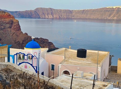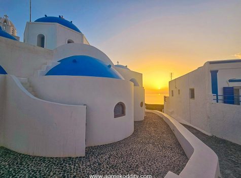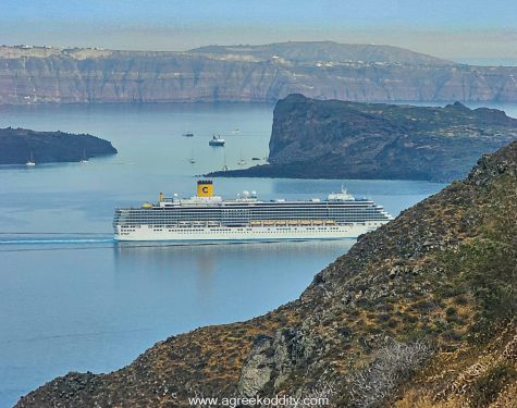 My host had arranged a taxi for me. As the only person to disembark from the ship, I’m not difficult to spot. As the taxi is the only one on the island – this isn’t difficult to find either! We exit the port and begin the gradual climb up above it. The landscape is very different to its volcanic cliff face. It’s as though a portal to another world has been opened. The back of the island has a flat plateau around the edge which appears mainly agricultural. There are several vineyards scattered around the landscape and seem to be thriving in the fertile volcanic soil. After all, Thirassia is the little sister of Santorini and shares the same genetic makeup or rather geology. They are both two of five islands to be created after a series of catastrophic volcanic eruptions thousands of years ago.