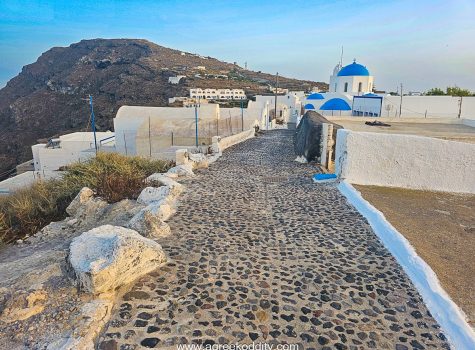My priority right now is to go to the minimarket for supplies. In this heat, one bottle of water won’t go far enough. Once out of the gate, the road descends sharply into the village. I already anticipate that the climb back up is going to be a slog. I reach the path that leads into the village. It’s made of volcanic stone that has absorbed the heat. This permeates through the soles of my shoes – or so it feels.