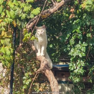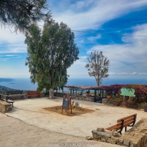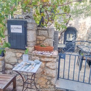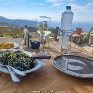 I take a seat on the terrace with the view over to the bay below. A friendly lady takes my order of horta, the beef in tomato sauce with orza and a glass of wine. The food is delicious though I do have to retreat to a table inside to escape the wasps that descend upon me as soon as the plate hits the table. A small group of tourists arrive and also sit inside the taverna – not because of pesky insects but because the mountain breeze is too cold for them. The weather is perfect for someone from the North of England like me! Excellent meal and service!