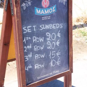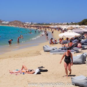 We mosey on down to Agios Prokopios Beach and my first impression is shock. Shock at how busy this beach is and how many sunbeds and umbrella’s they’ve managed to cram into such a small space. I’m a bit disappointed to see this to be honest. I’m even more disappointed to see the Mykonosation of the beach with the various classes of sun lounger based on row position. I just hate it. I appreciate that after an economic recession, a pandemic and a new economic crisis looming that businesses need to strike whilst they can, but at what cost?