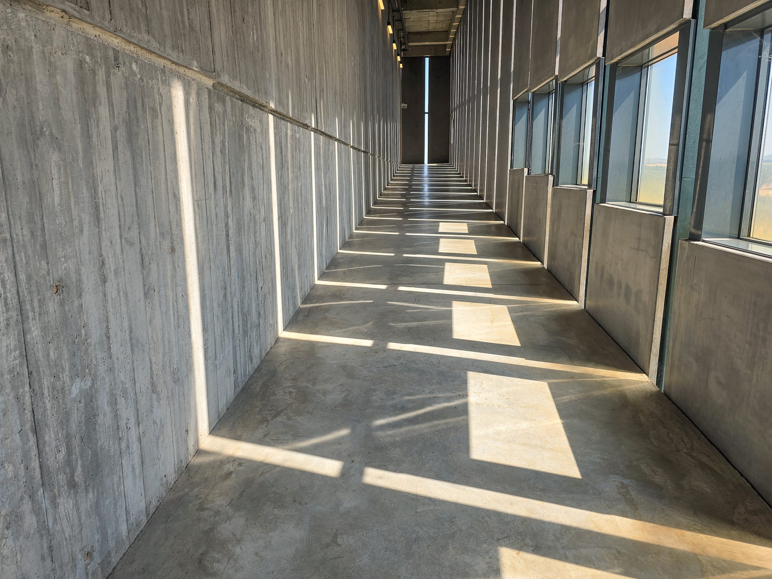 The approach to the entrance took us along a path lined with archaeological artefacts such as sculpted stone sarcophagi. In front of us, the museum building emerges from the ground as a large cube clad in a shell of rusting Corten, like an undiscovered artefact slowly revealing itself from the earth. The striking oxidised appearance blends seamlessly with the ochres and russets of the surrounding plain.