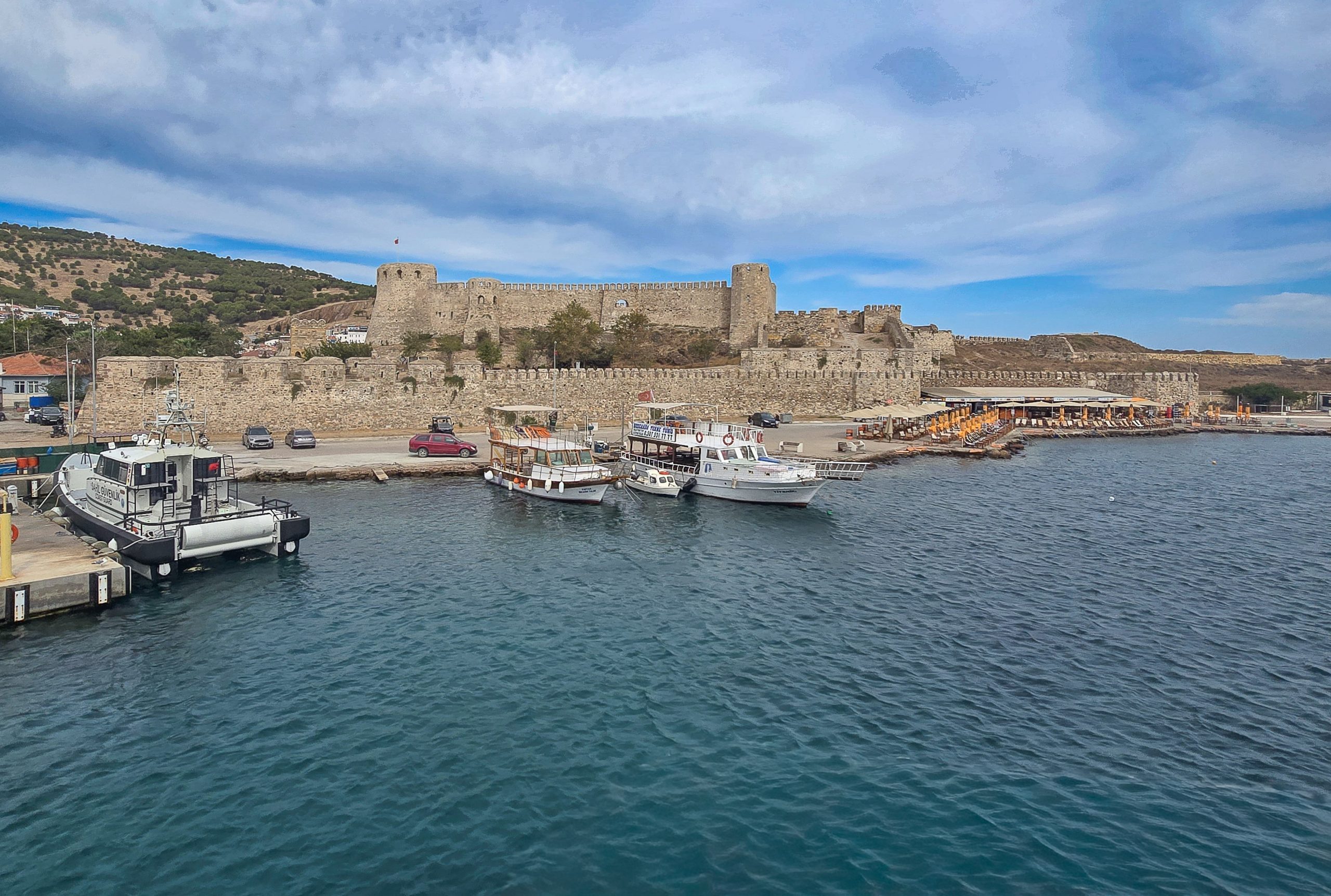 After leaving Yenibademli, we found ourselves on an open stretch of road. Not many cars passed, but it gave us an idea of the lay of the land. Up above, we could see a castle atop the hill. Soon, we passed through the entrance to the village nestled in a small bay.