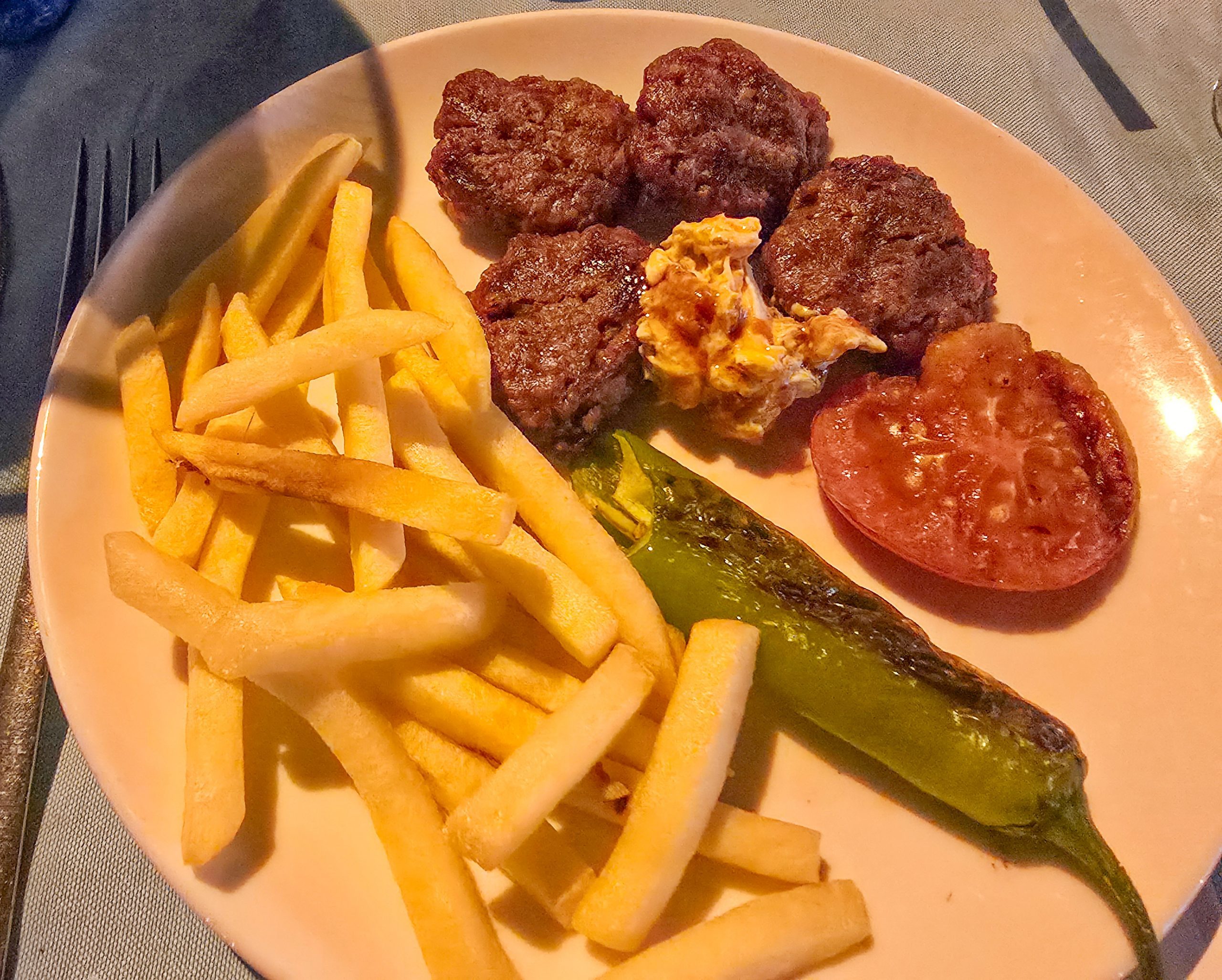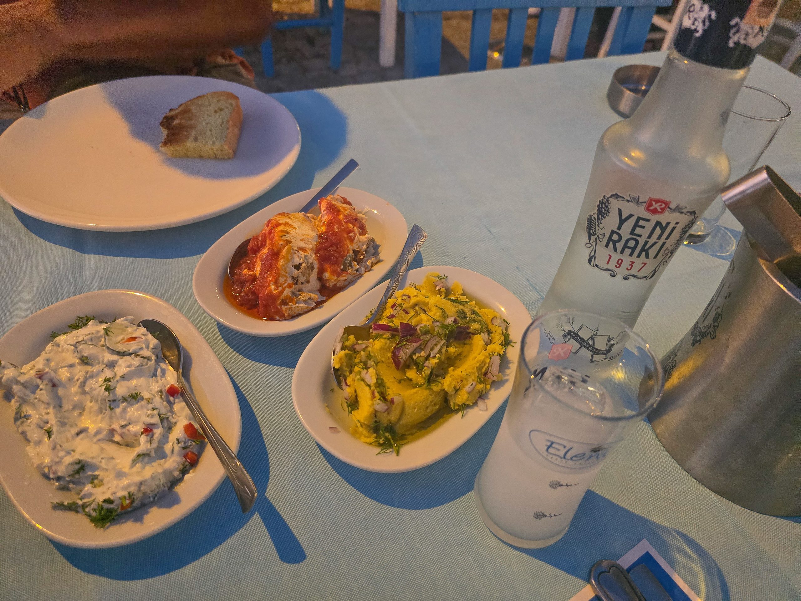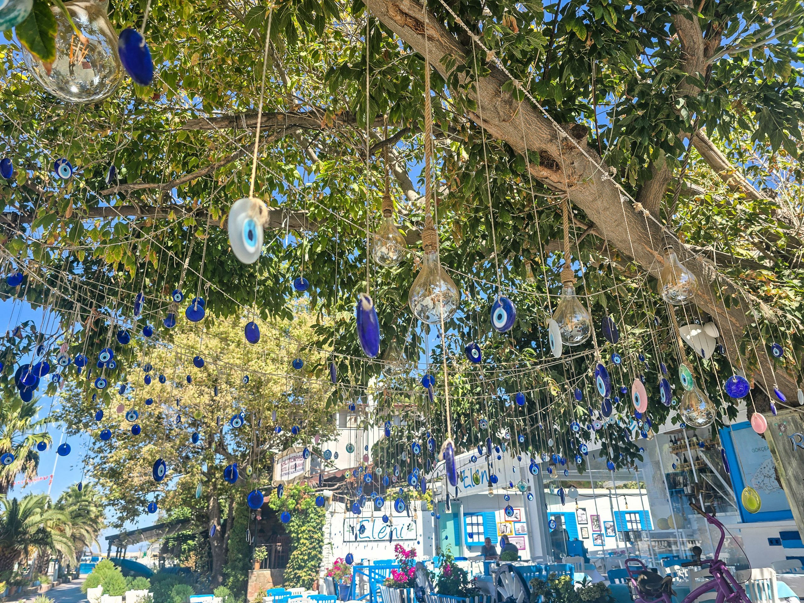 By now, we were ravenous and more than a little worn out. Almost next to the Fengari was a restaurant called Eleni, where we were drawn in by its blue Mediterranean décor and a tree draped in Mati – evil eyes. Although it looked and sounded Greek, the food was very much Turkish. We were invited into the kitchen to choose our starters — something that now felt charmingly familiar — before settling on our mains. After a journey involving more connections than the multi-plug extension at the back of my PC, we decided we’d earned a Yeni Rakı or two! I think Gokceada is going to be everything I hoped it would be!