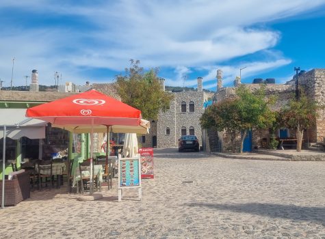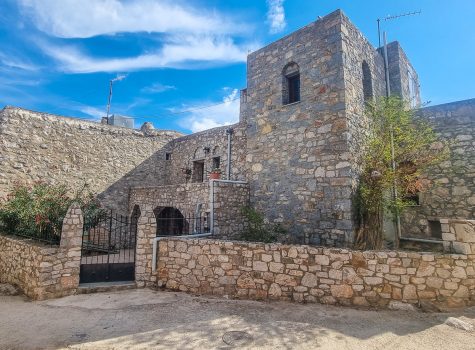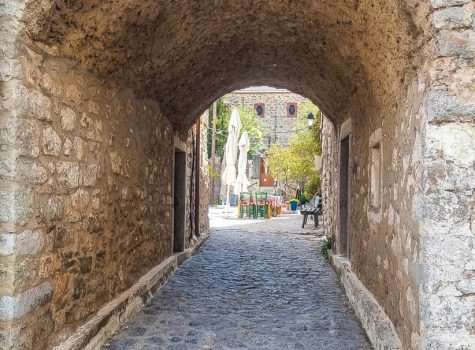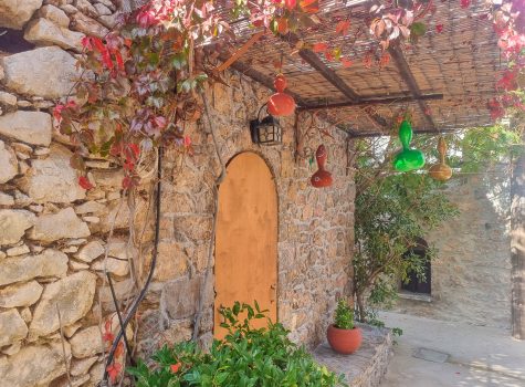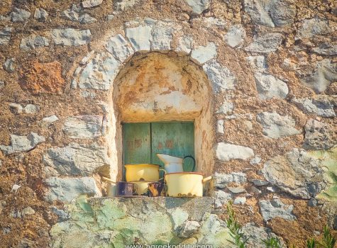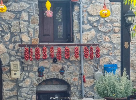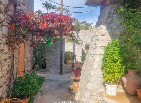 Avgonima is another of Chios’s medieval fortified villages that has undergone some restoration since it was almost abandoned in the 1960s. There is a good choice of accommodation and several tavernas to choose from. The focal point on the main square is the church, and from here the alleyways seem to radiate out in all directions past stone houses draped in bougainvillaea and potted plants. Several houses had strings of cherry tomatoes against the walls drying in the sun.