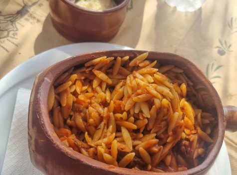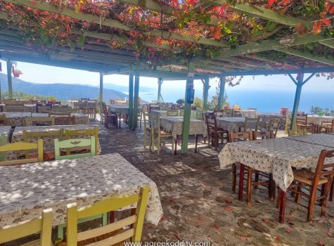 I took a seat on the terrace overlooking the bay. A friendly lady took my order: horta, beef in tomato sauce with orzo, and a glass of wine. The food was delicious, though I retreated inside to escape the wasps that arrived the moment the plate landed. A small group of tourists also sat inside — not because of insects, but because the mountain breeze was too cold. For someone from the North of England, the weather was perfect. Excellent meal and service.