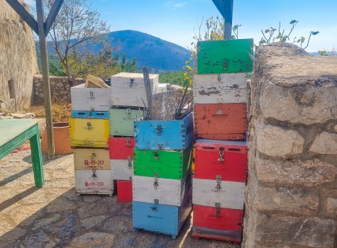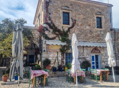 After lunch, I took another wander around the village. With my day job hat on, as a travel consultant with Hidden Greece, I wanted to say hello to George, who owned Spitaki Cottages, one of the hotels we work with. Unfortunately, there was no sign of him at the property. I know he’s a busy man with his fingers in several pies, so I headed to the square where I’d seen a sign for honey for sale. I’m a sucker for Greek honey — especially the old Meli Pinus! 😂 (you had to be there!)