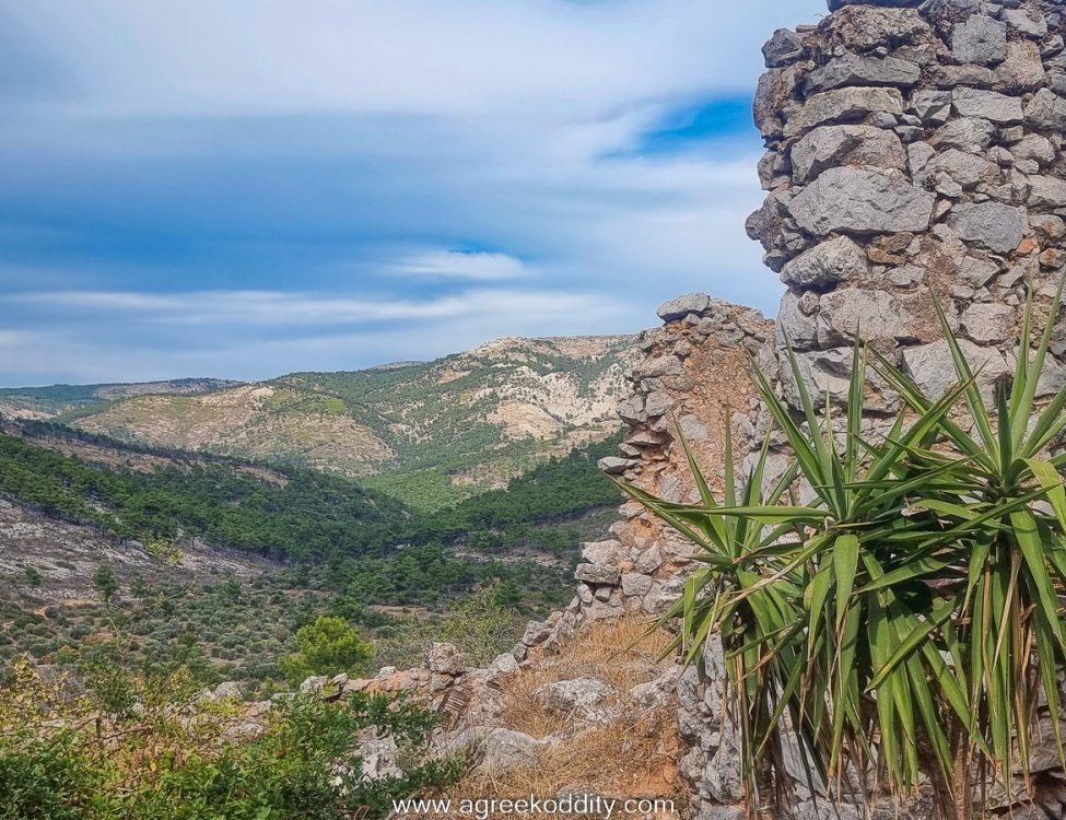 Soon, Avgonima came into sight. This is the same route to Anavatos, so it all looked familiar. I was confused when the bus drove straight through the village. At first, I wondered if there was another road further along that stopped closer to the village entrance, but soon the village began to look far away. What I didn’t know was that Avgonima was a request stop. I’d assumed that the driver had seen my ticket, which definitely said Avgonima, but that didn’t seem to be the case. I walked to the front of the bus as it swayed side to side and said “Avgonima?” He replied, “No Avgonima”. Oh, maybe I have to spend another afternoon at Anavatos. He did that up and down hand movement, which was clearly telling me to sit down, which I did. The Doris Day song Que Sera Sera came into my head. Just go with the flow, Stephanie, just go with the flow.
