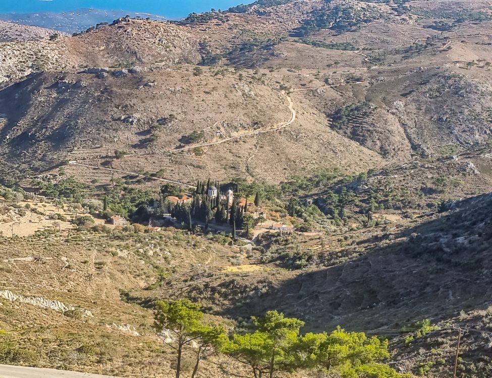 Further down the road, the driver dropped the couple off at the top of the track above Nea Moni, the island’s spectacular monastery. I learned later that Avgonima lies about three kilometres from Nea Moni monastery via old stone-paved tracks.