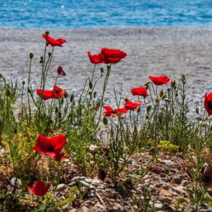 For the rest of the afternoon we walk along Kardamyli beach which is completely deserted apart from one dog walker. Spring flowers are scattered everywhere and have even self seeded in the sand.
