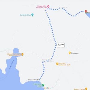 Just beyond the petrol station is the pretty stone church of Evangelistria which sits in the heart of Messaria – though don’t expect a it to feel like village as it is more of a small hamlet made up of smallholdings and one taverna.  We stop off at Taverna To Petrino for breakfast.  We order omelettes, tea and orange juice.  When they are brought to the table the owner who doesn’t speak English, points to the omelettes and then over to his small holding with a hutch full of chickens.  These are probably the freshest omelettes we will eat on this trip!