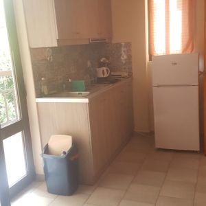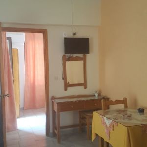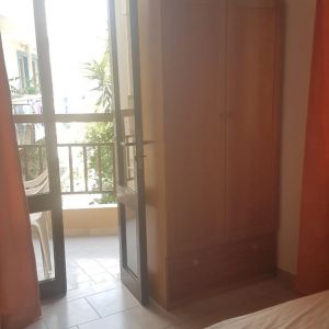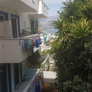 The apartment was large and bright with two sets of patio doors onto the balcony. It also had a newly fitted kitchen. The balcony overlooked a quiet courtyard which was a nice place to sit and eat breakfast each morning – and if you stood on tiptoes you could see the sea! The bathroom and living space was a little dated but clean. Not bad for 36.50 euros per night – in Karpathos terms that is.
