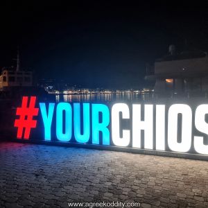 Later on that evening I decide to try a new restaurant and choose Kentriko on the harbour front. I have stuffed courgette flowers, tomato balls with tzatziki and meatballs in a tomato sauce. With wine of course. Tonight the full moon begins to wane. I hadn’t been able to see it at its peak from Pyrgi as you are surrounded by medieval towers but tonight I can catch a glimpse of it. The Psara Glory sails out beyond the harbour wall back to Psara for the night. Sorry for the blurry photo’s – taken from across the road whilst eating and drinking – and the ship just wouldn’t stay still!