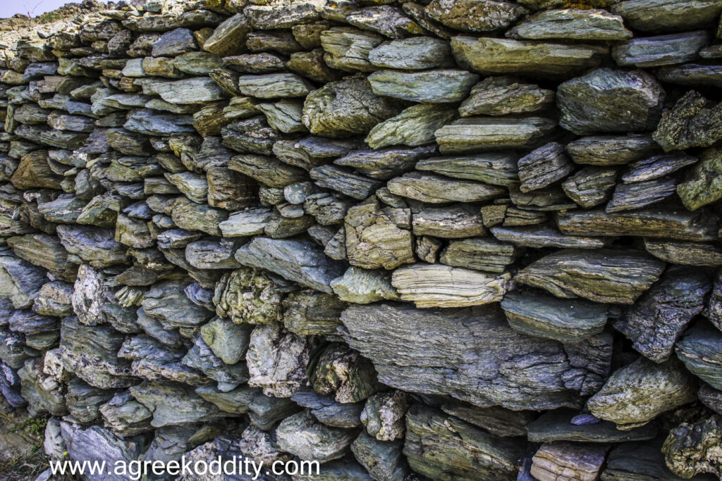Dry stones walls made with the green island slate line the road and also define property boundaries around stone houses.