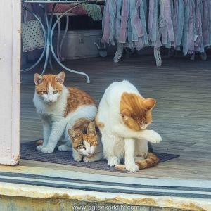 The pizza is actually first class though much too much for one person. The cats try to help me finish it but I manage to keep them at bay. Katerina occasionally comes to shoo them off but they are persistent little buggers!