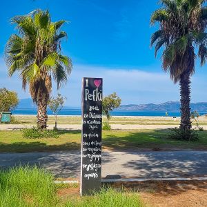 There is no time to waste so I head out onto the main drag to do a little exploring. Pefki Beach is around 4km long and is a mixture of sand, large and small pebbles. It is backed unusually by patchy grass that is edged with a wide concrete walkway – perfect for evening promenading. The road that runs between the walkway and a row of hotels, shops and tavernas is separated by a large grassed central reservation which appears very elaborate for such a short stretch of road. It doesn’t seem to be busy, despite the number of visitors still here. The season is drawing to an end and yet the village still has life – lots of it.