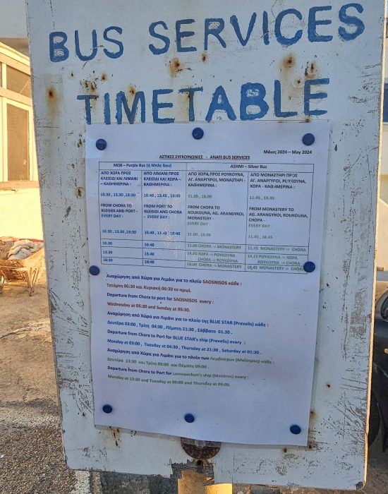 Yesterday I’d taken a photo of the bus timetable which showed three beach destinations – Klisidi, Roukounas and Agia Arangyroi. From these beaches, you can also access several others by walking via a track. Interestingly the bus also seems to connect with every ferry arrival and departure. It looks like the public transport on Anafi is a well-oiled machine!
