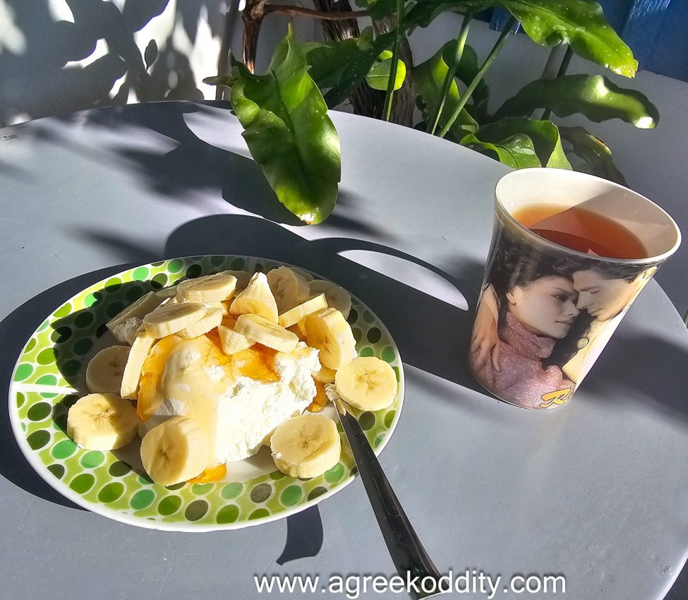 I start the day with a leisurely breakfast of Greek yoghurt, Anafi thyme honey and banana with a cup of tea on my lovely little balcony. This is as far as any self-catering will go!