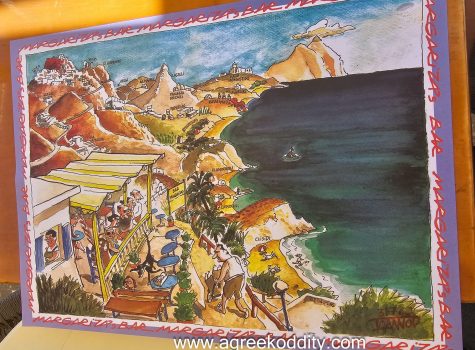Firstly Margarita’s gets the award for the best placemat I’ve ever had put in front of me. The colourful piece of artwork created by renowned Greek cartoonist Ioannou paints an entertaining scene of Margarita’s complete with resident beach nudists.