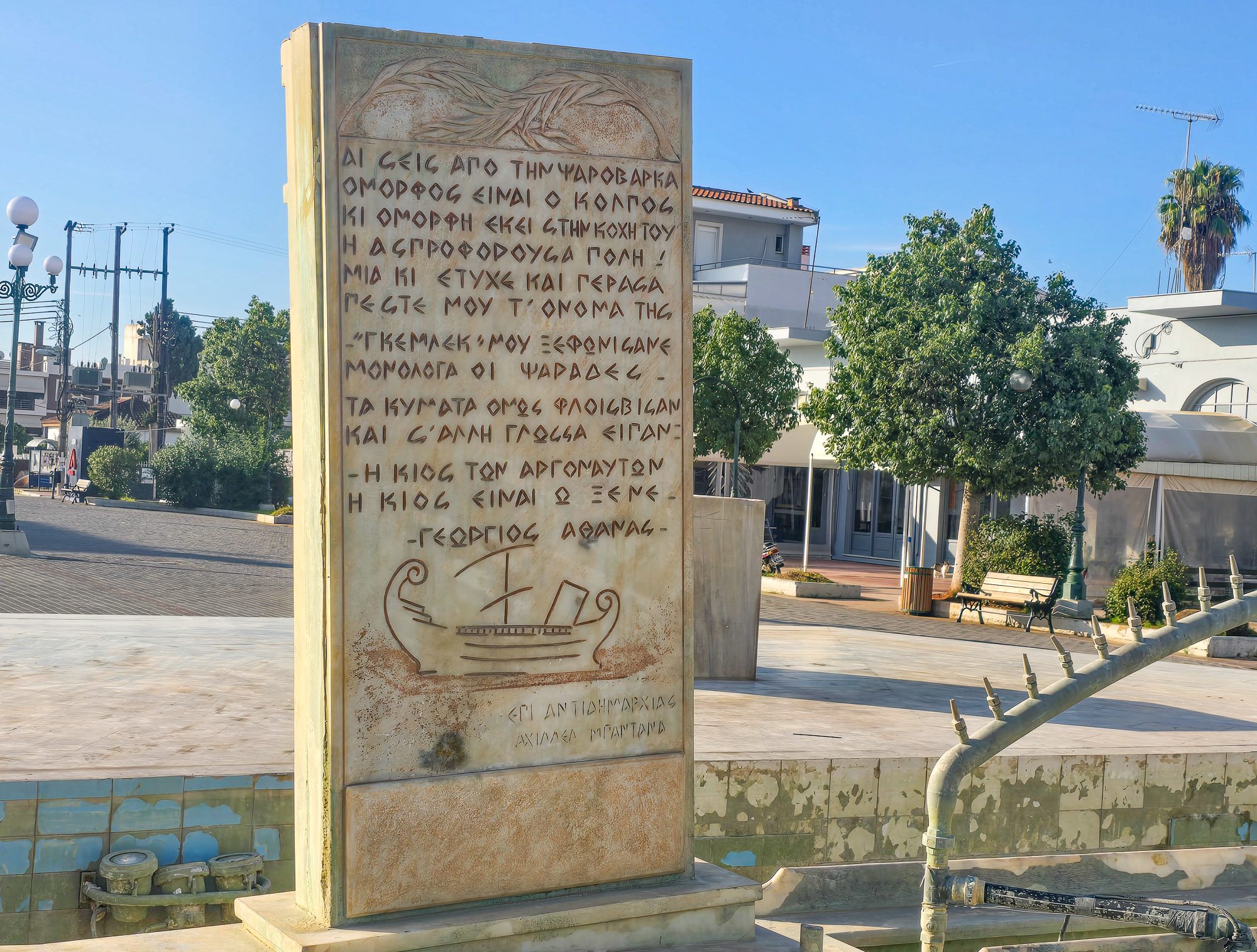 Inside the boat was a memorial stone heavy with symbolism. I interpreted it as Hellas in her female form, greeting a refugee, a more humble figure who had just arrived on the shores of Greece from Asia Minor. Above them, an inscription: “From ancient Kios, they set out as allies, exchanging homelands, following the path of uprooting, to settle here in Nea Kios.”